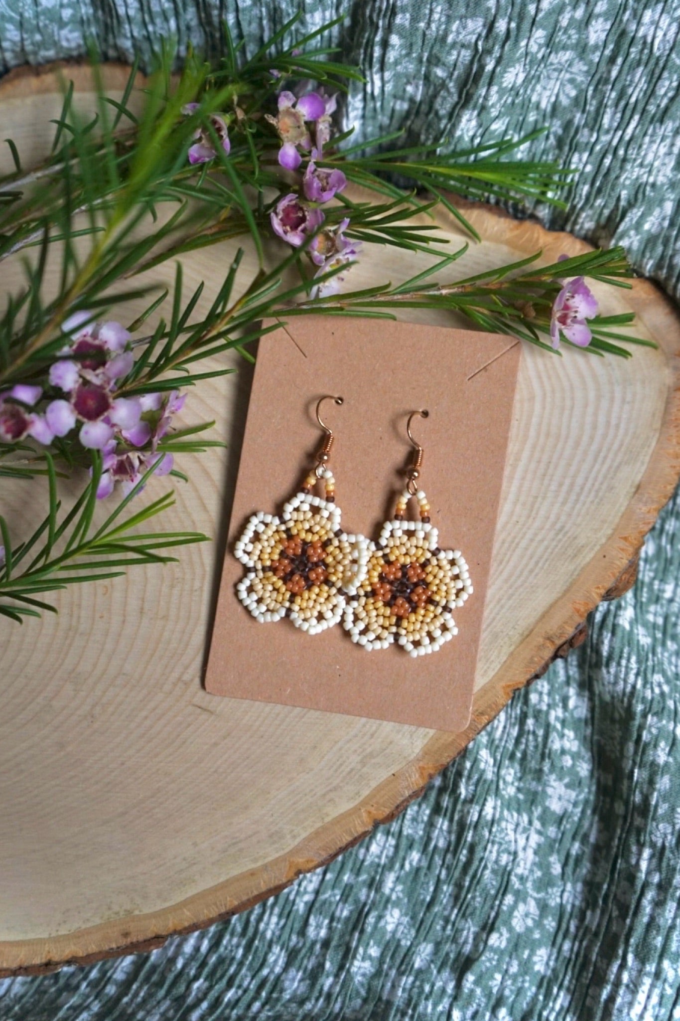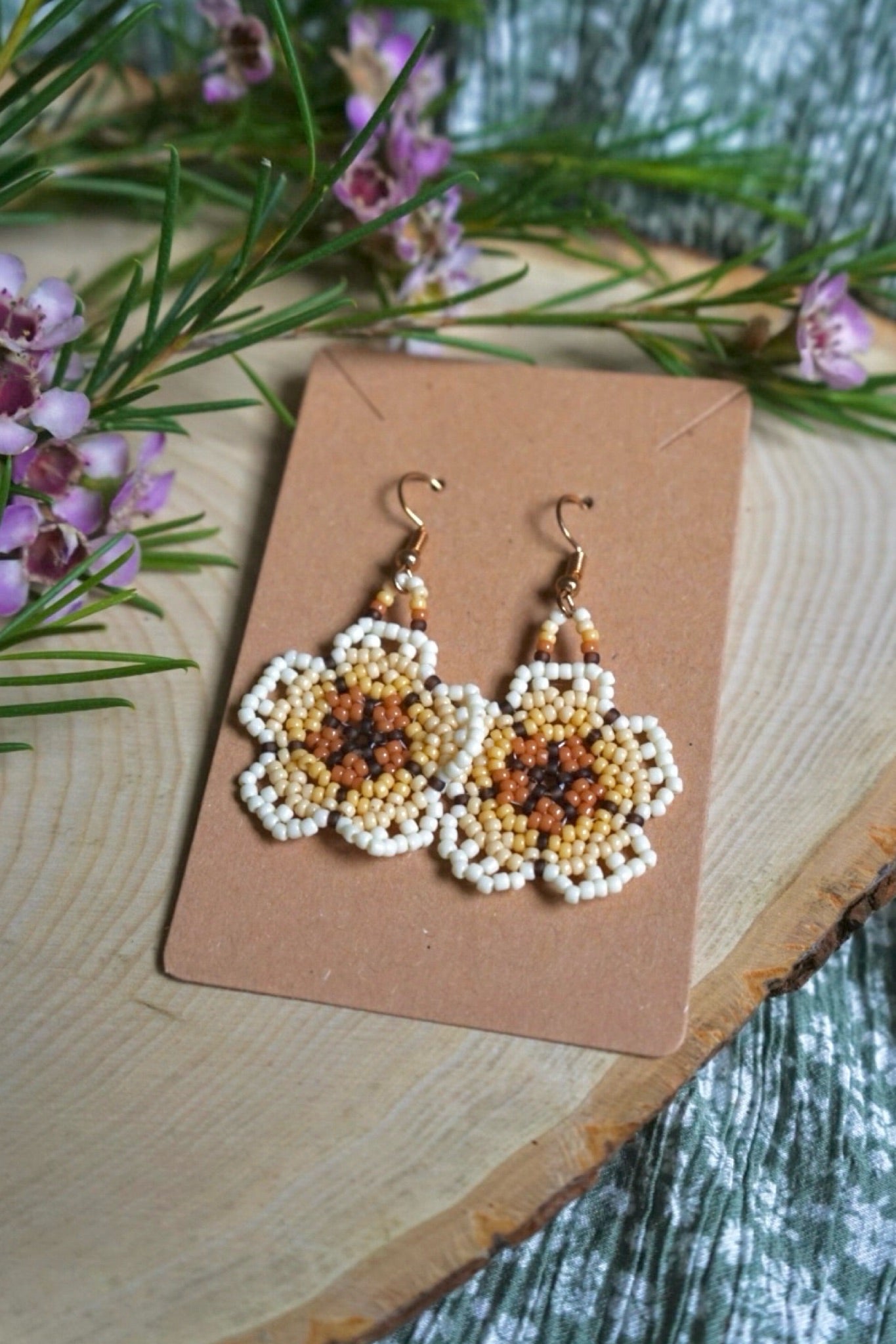 These earrings measure approximately 1.25" across and are made with size 11/0 seed beads.
