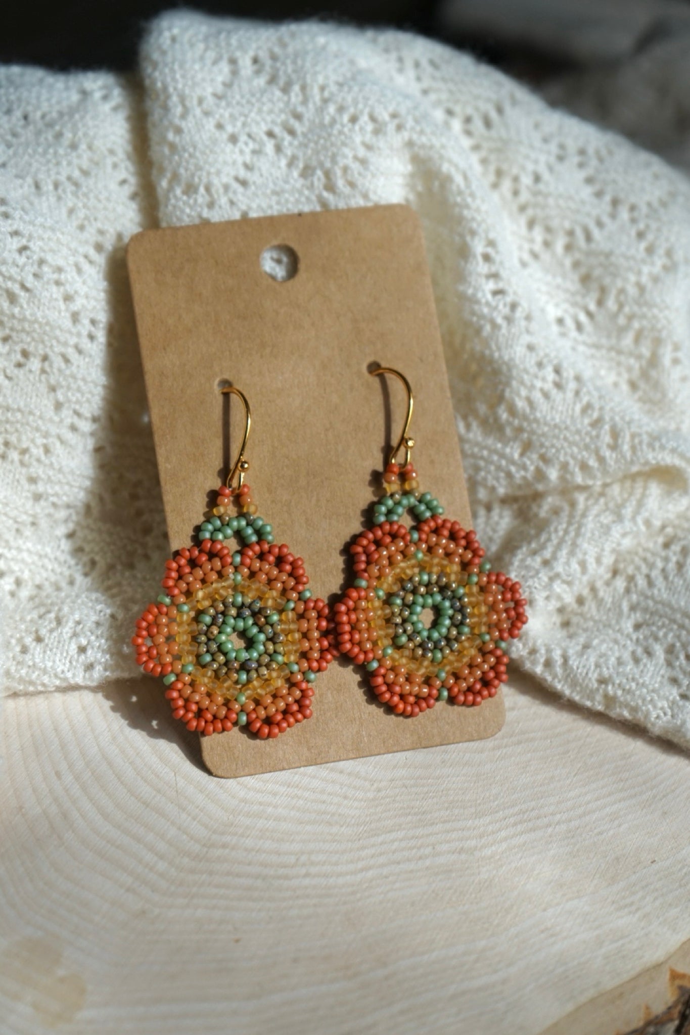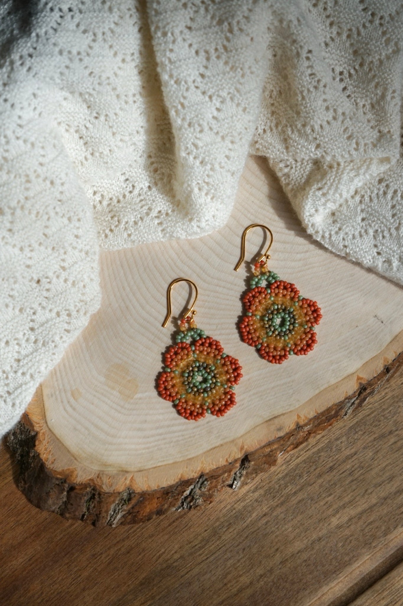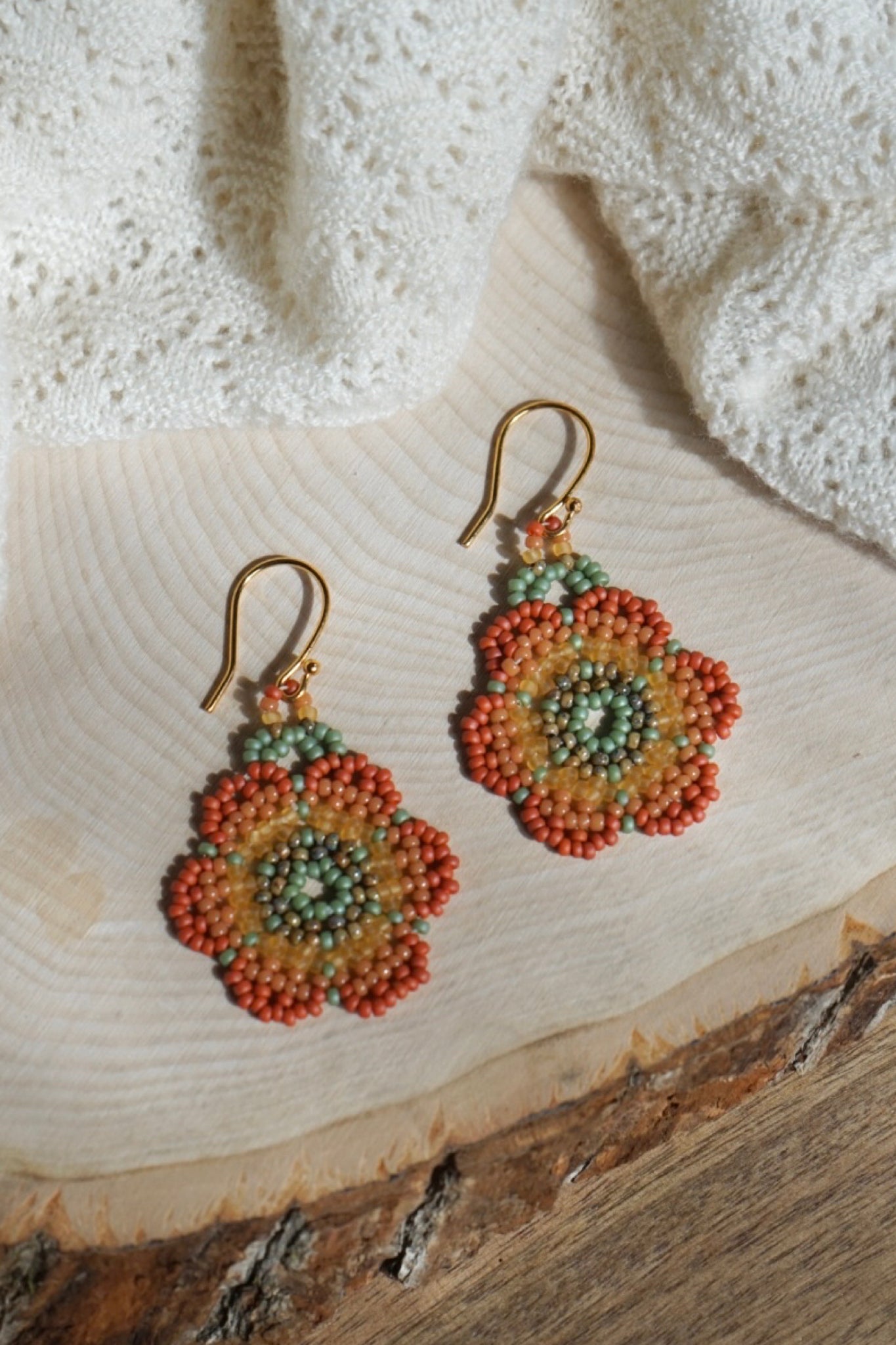 Originally intended to capture the red rock hues of Sedona, AZ, this pair fell more in line with the fallen leaves of autumn trees. These earrings bring together shades of red, orange, brown, and green. These beads encompass a beautiful variety of lusters and opacities, with a mix of matte, translucent, and picasso style beads.