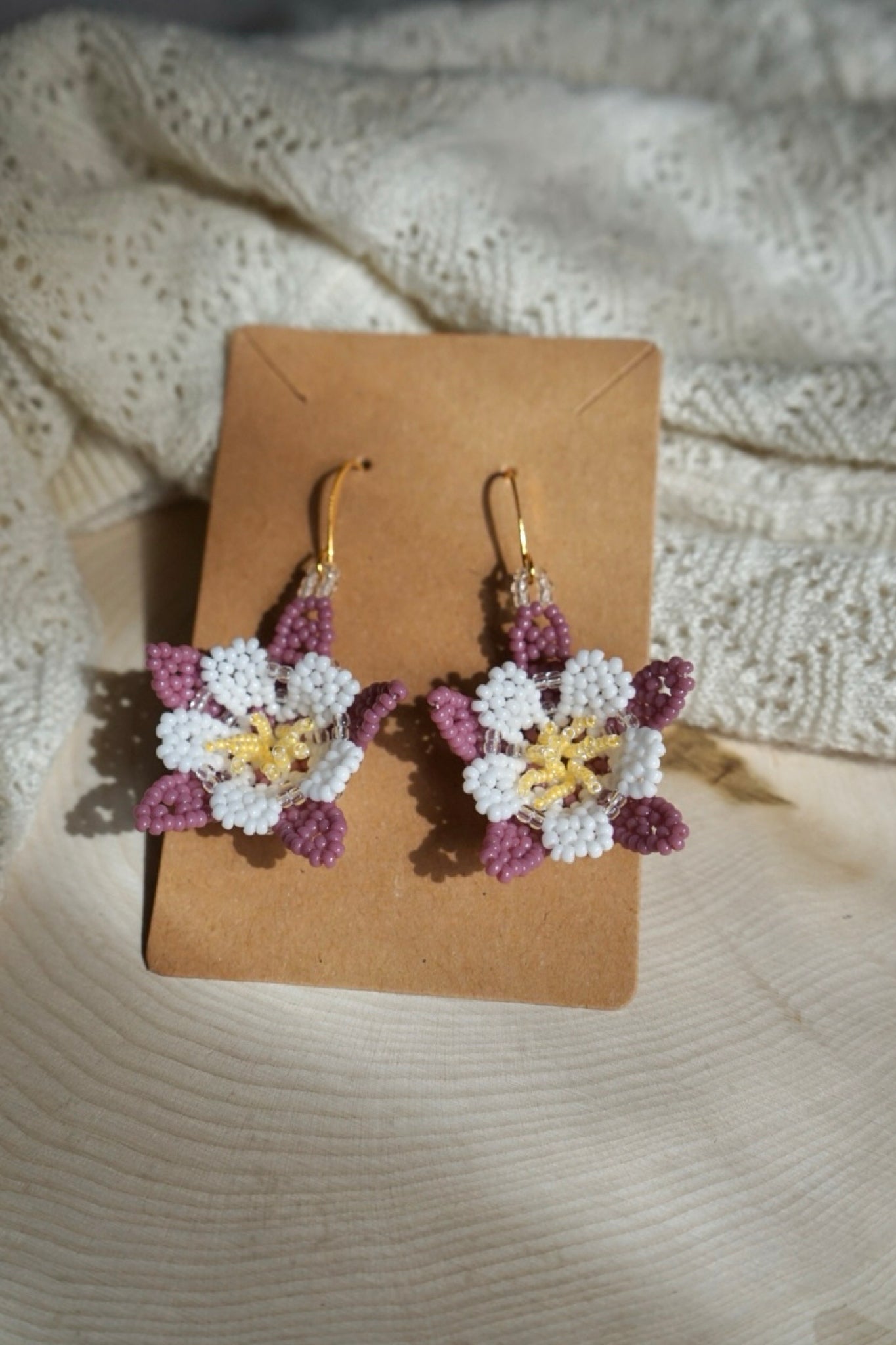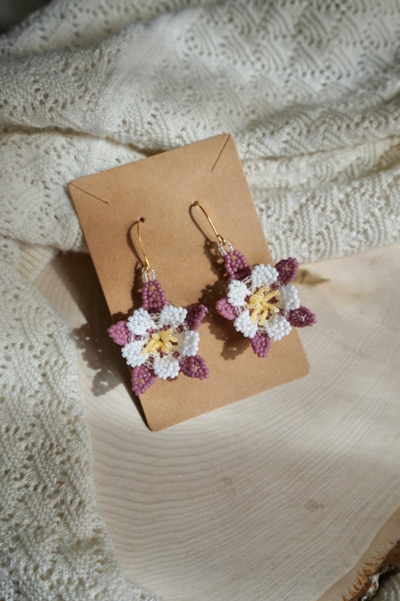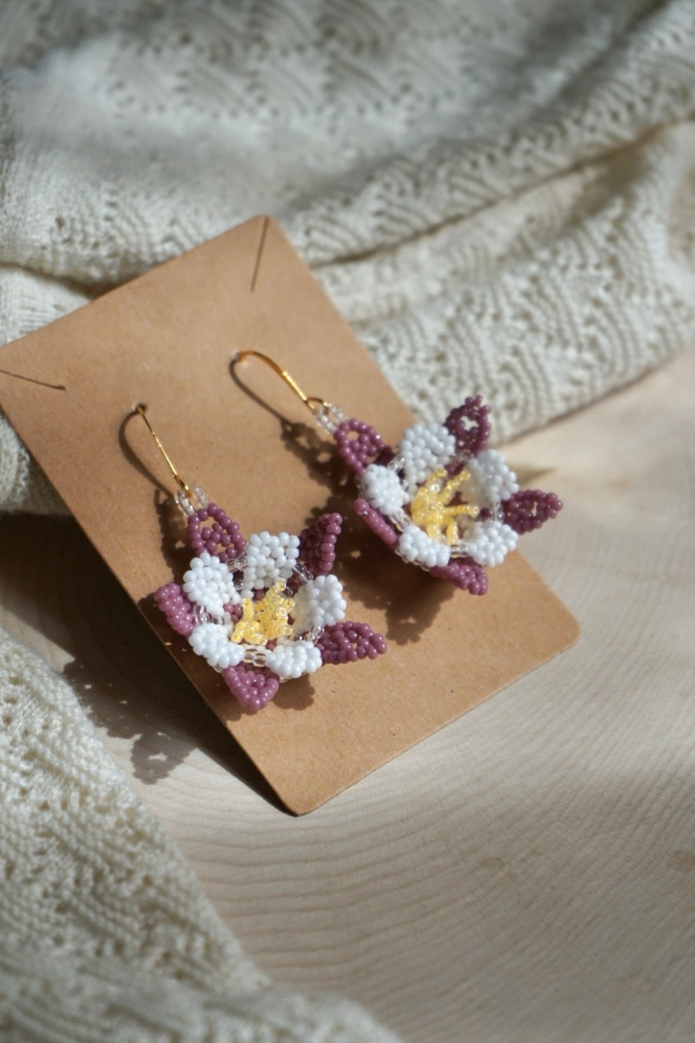 Made with primarily size 11/0 seed beads and yellow size 13/0 seed bead stamen. These earrings measure approximately 1.5" across and are 3D with an approximately 0.5" thickness. They're big, but not too heavy to be uncomfortable.