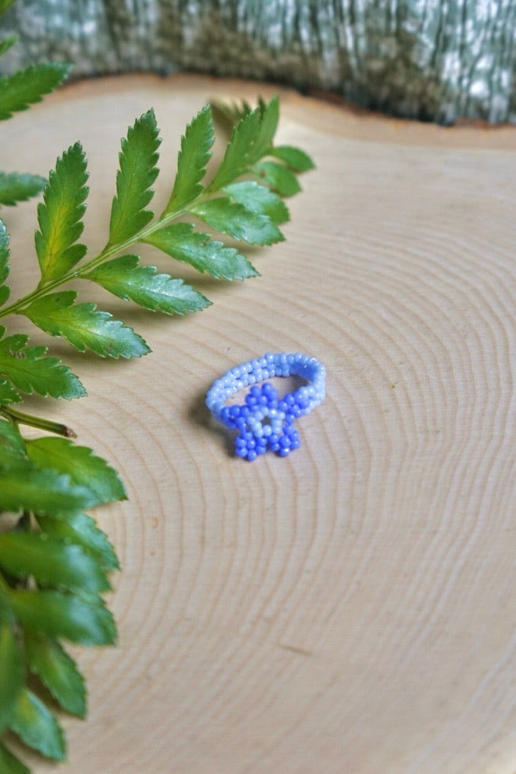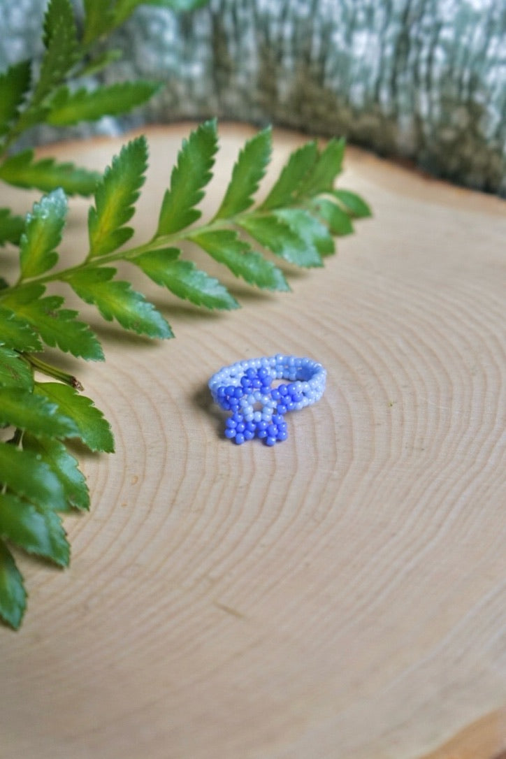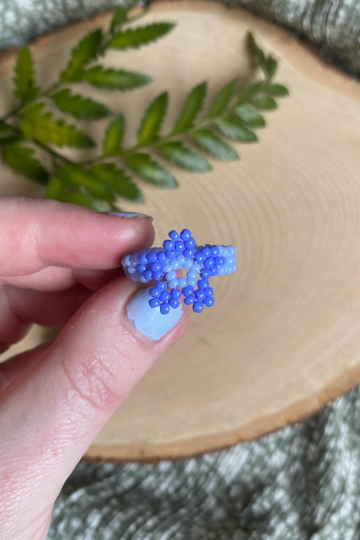 Made with size 11/0 seed beads in two shades of a beautiful cornflower blue color. This ring features a pale blue for the band and flower center, with darker blue petals.