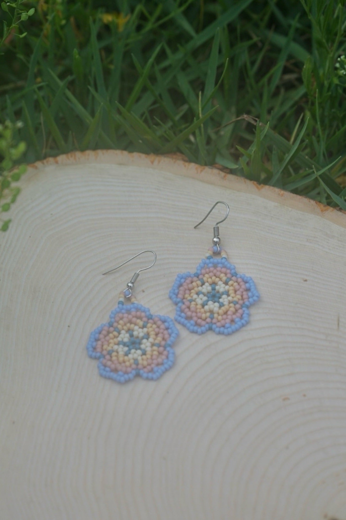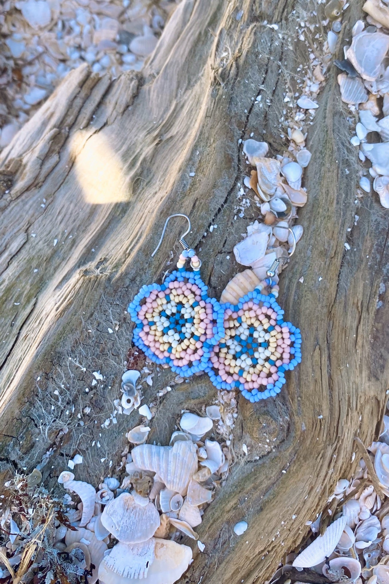 This pair of earrings features soft pastels and dusk blue colored beads, inspired by the soft colors of a sunset.