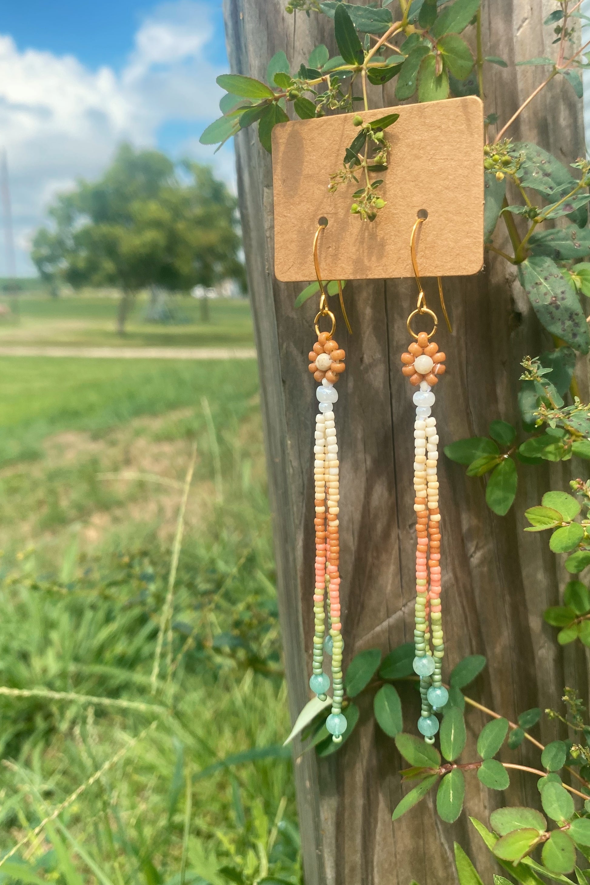 This dangly pair is made with bright pastel colors, for a boho yet earthy vibe. Natural aventurine round beads hang from each strand and the earrings are hung from a beaded daisy with a round amazonite bead at the center.