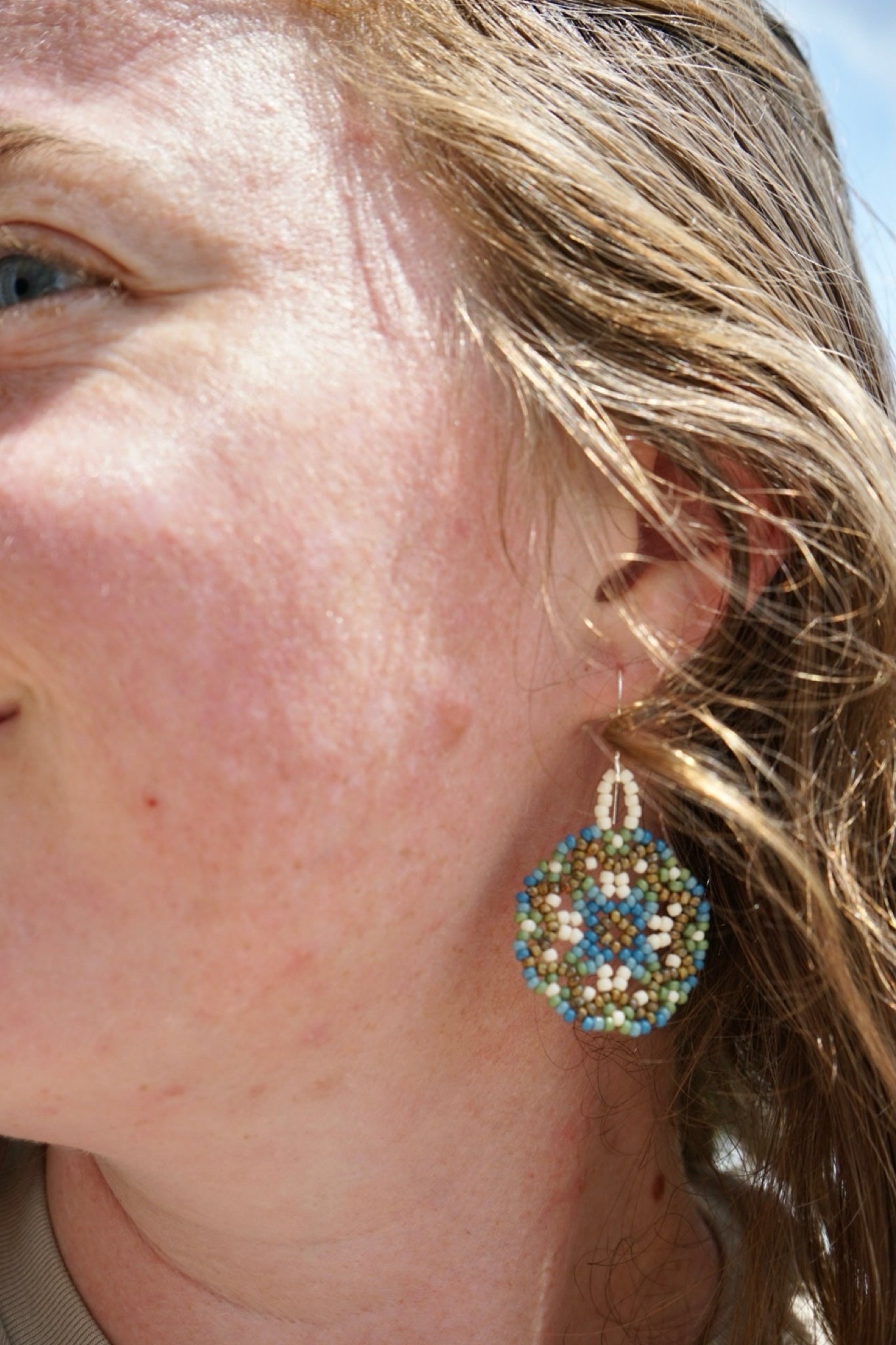 These earrings are a beautiful combination of earthy hues - Picasso brown beads, blue, green, and cream - to make an earthy accessory. Made with size 11/0 sead beads, this pair measures approximately 1.25" across.
