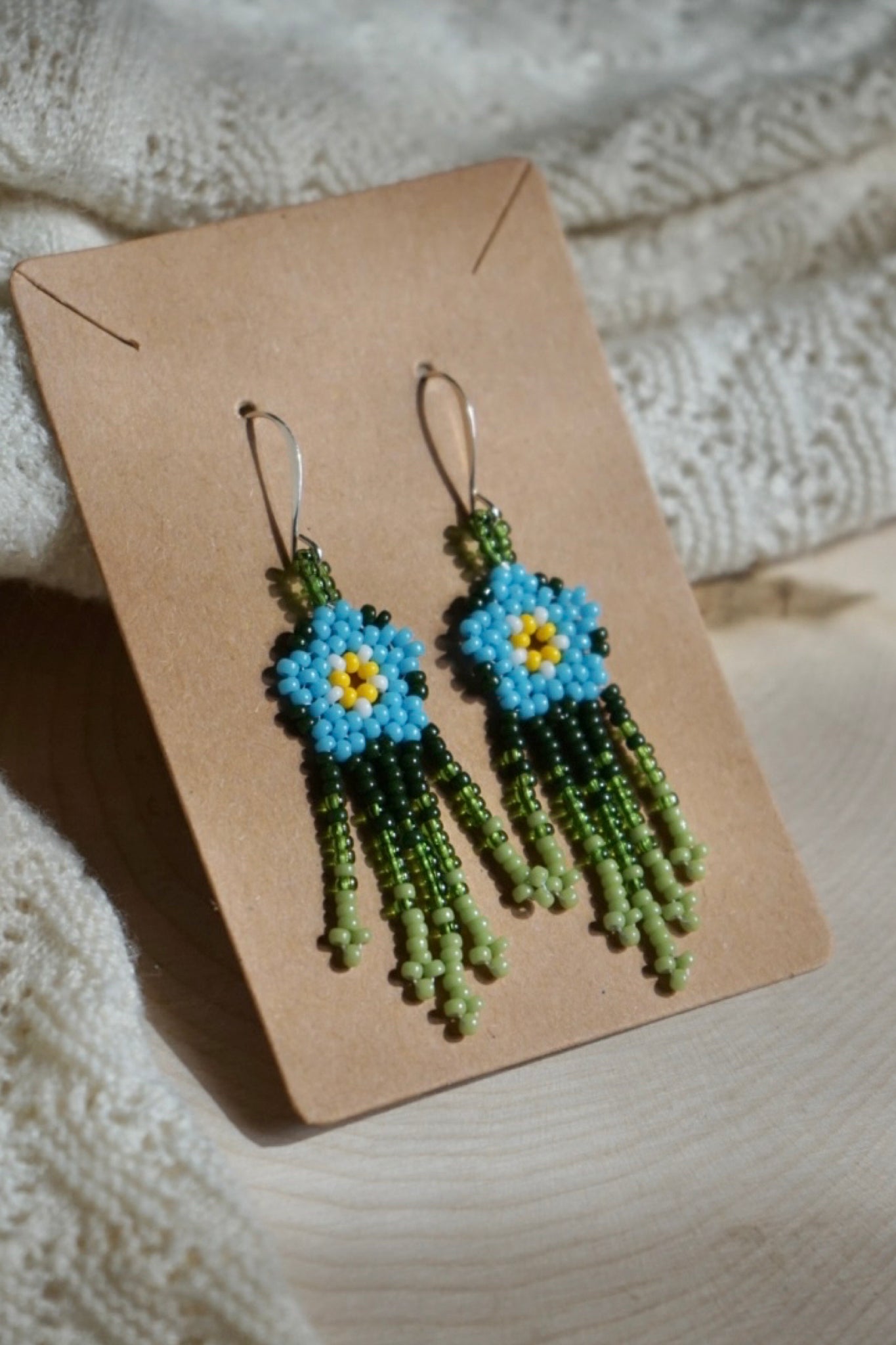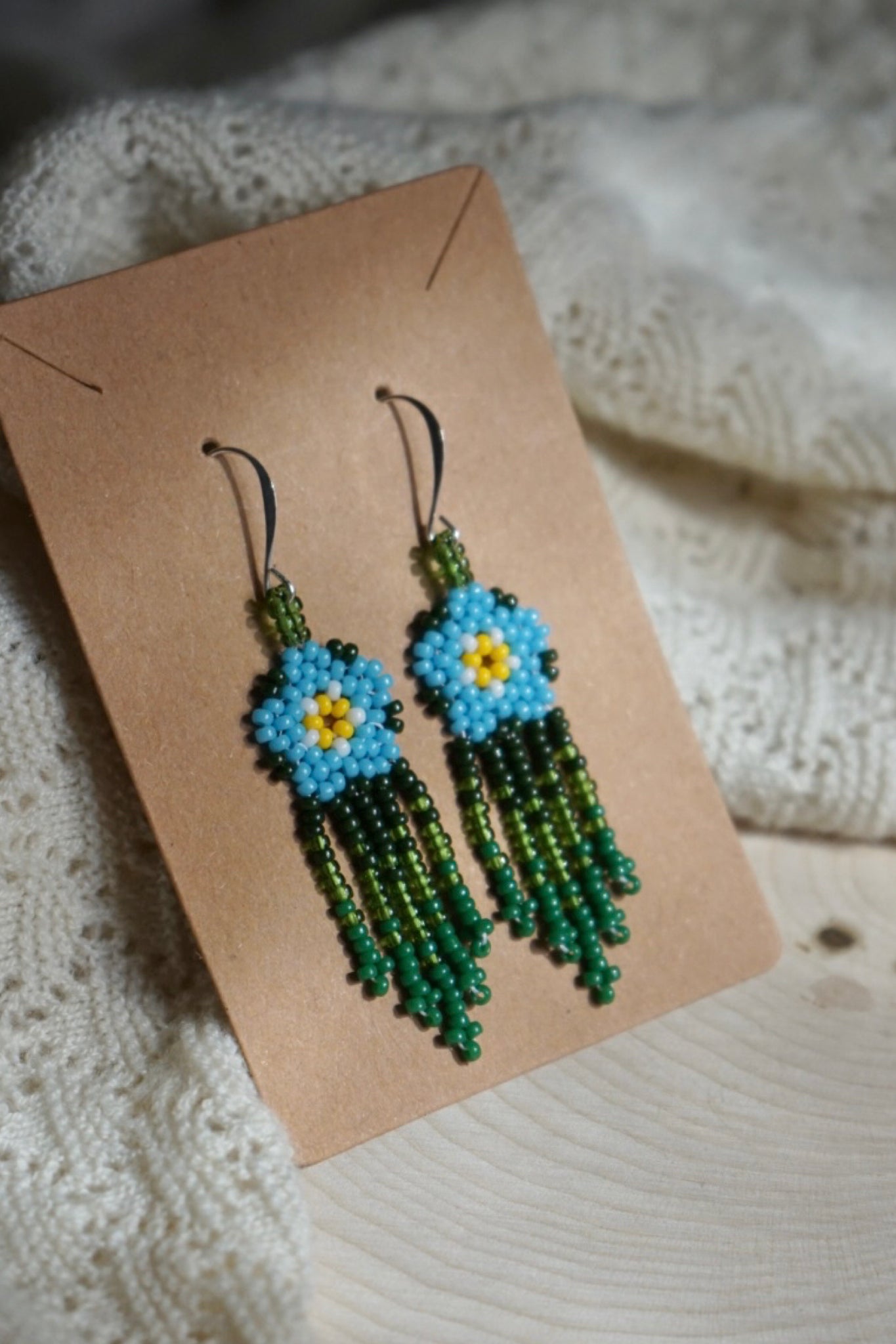 These earrings are made with size 11/0 seed beads and hang slightly over 2.5" from the top of the hooks to the bottom of the fringe. The earring hooks aresilver-plated brass.