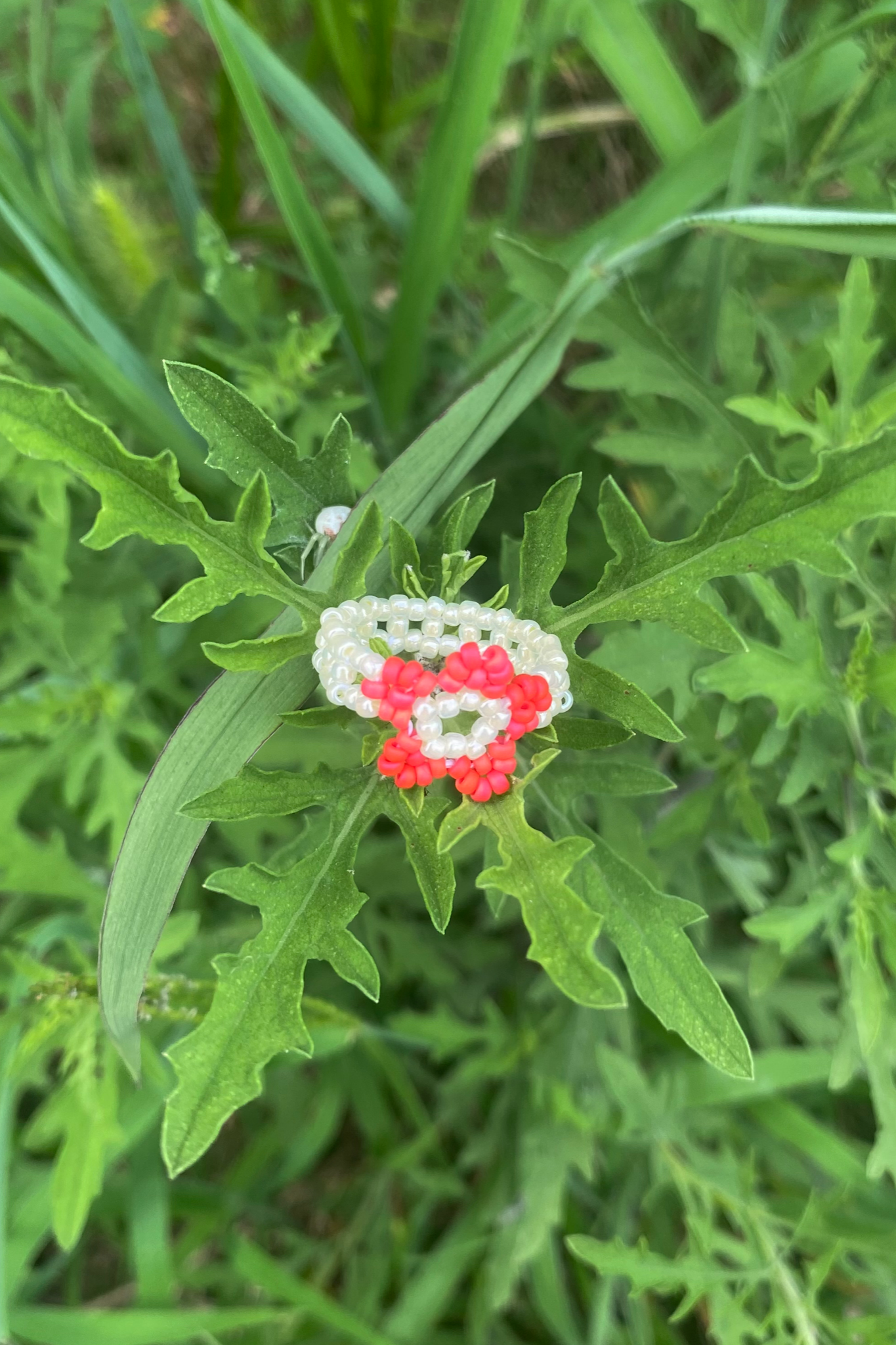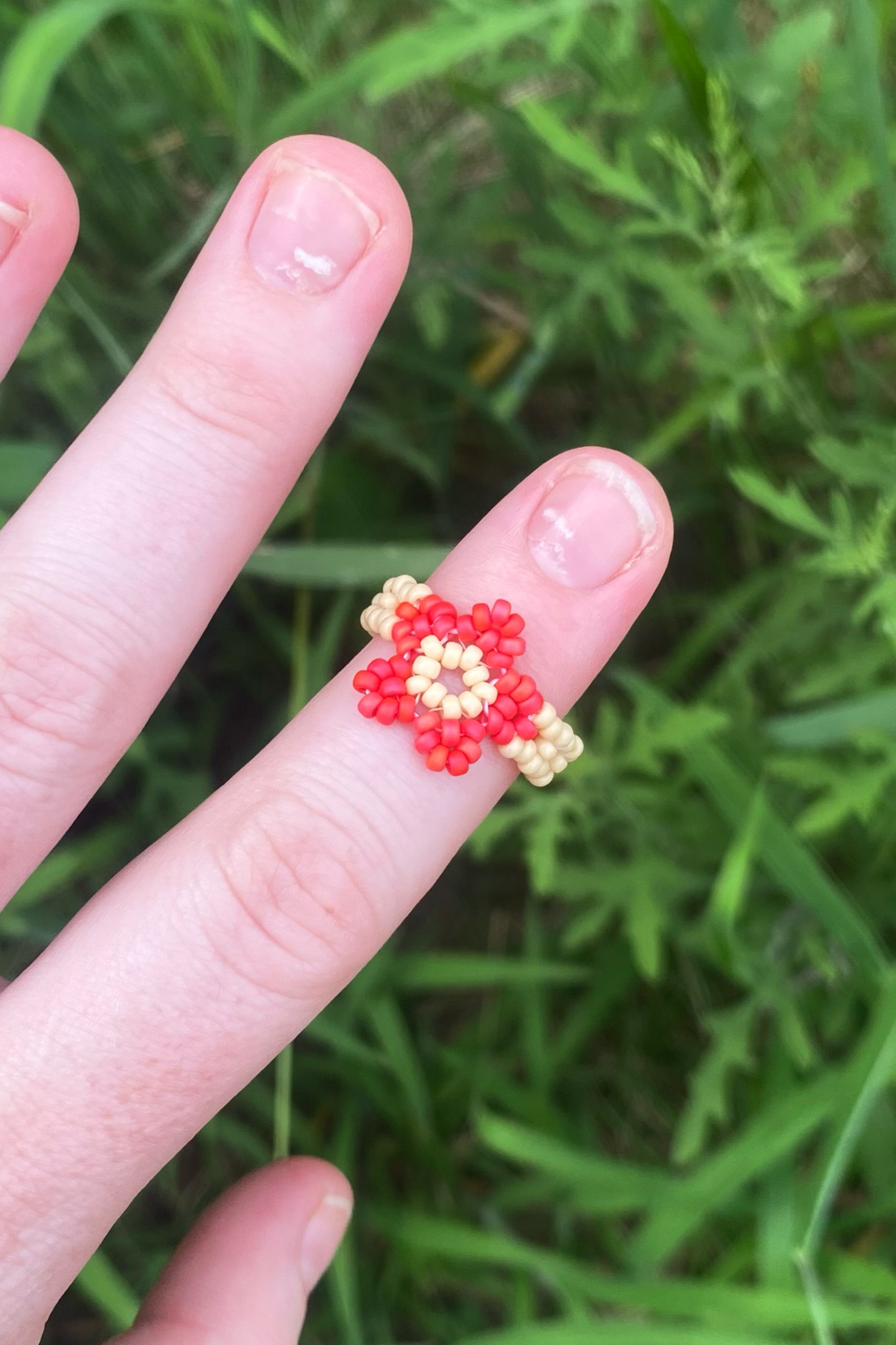 This ring is made with size 11/0 seed beads - with vibrant pink petals and a creamy pearl colored band.