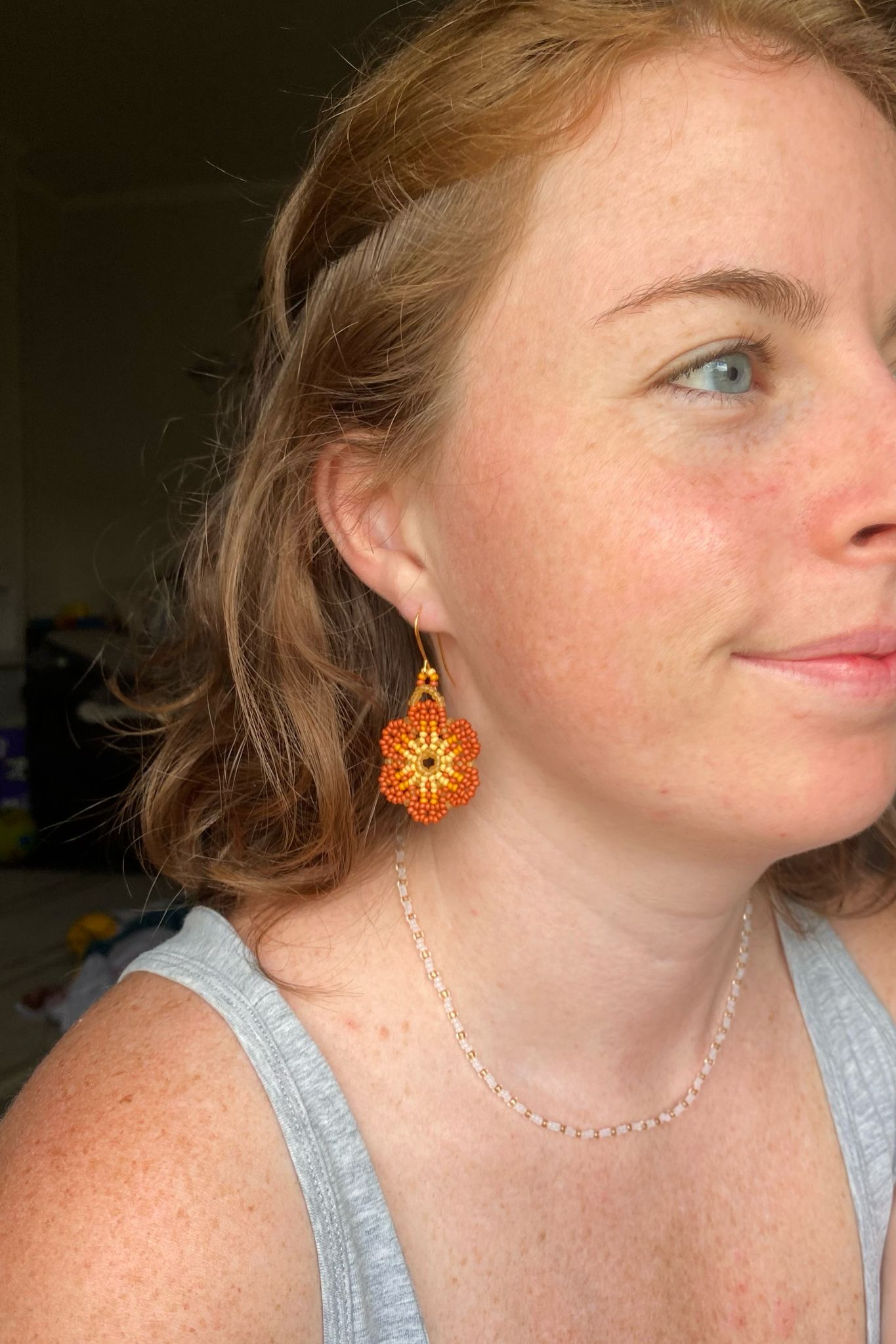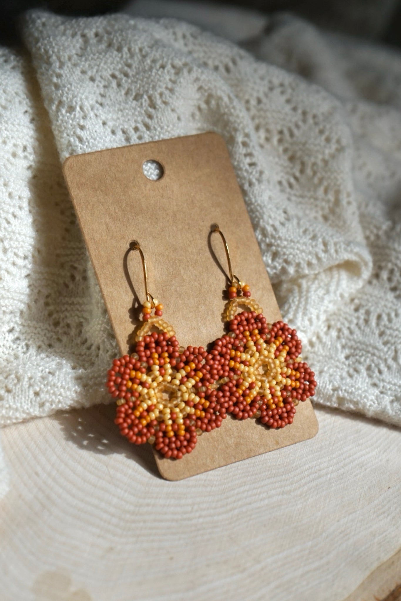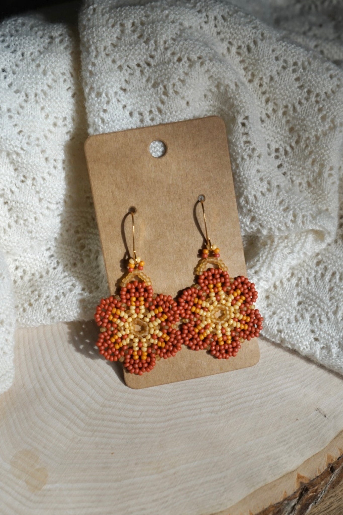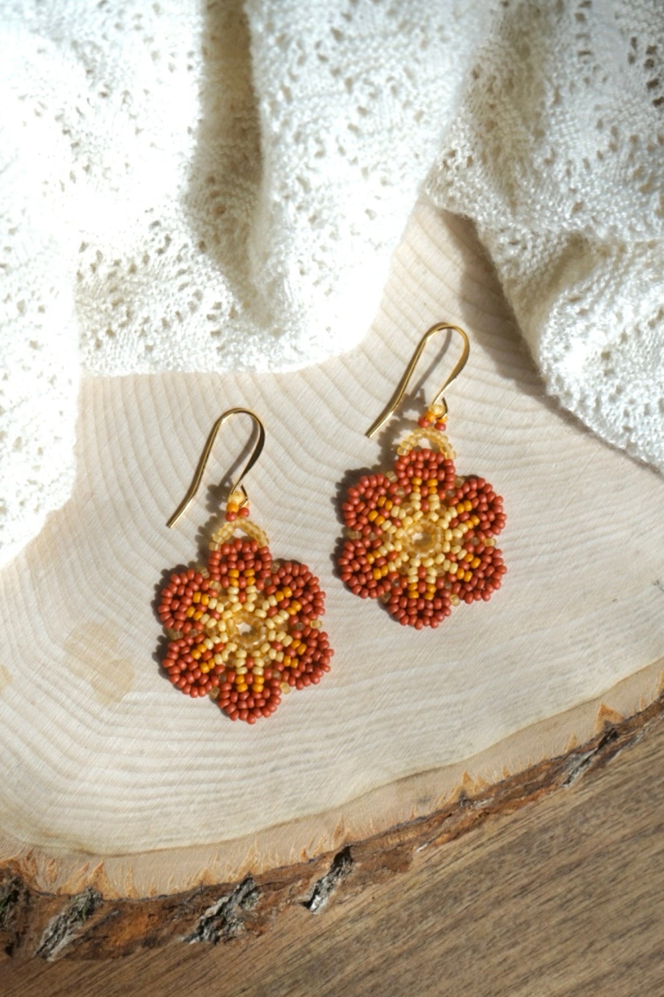 These earrings are made with size 11/0 seed beads and measure approximately 1.25" across. The earring hooks are gold-plated brass.