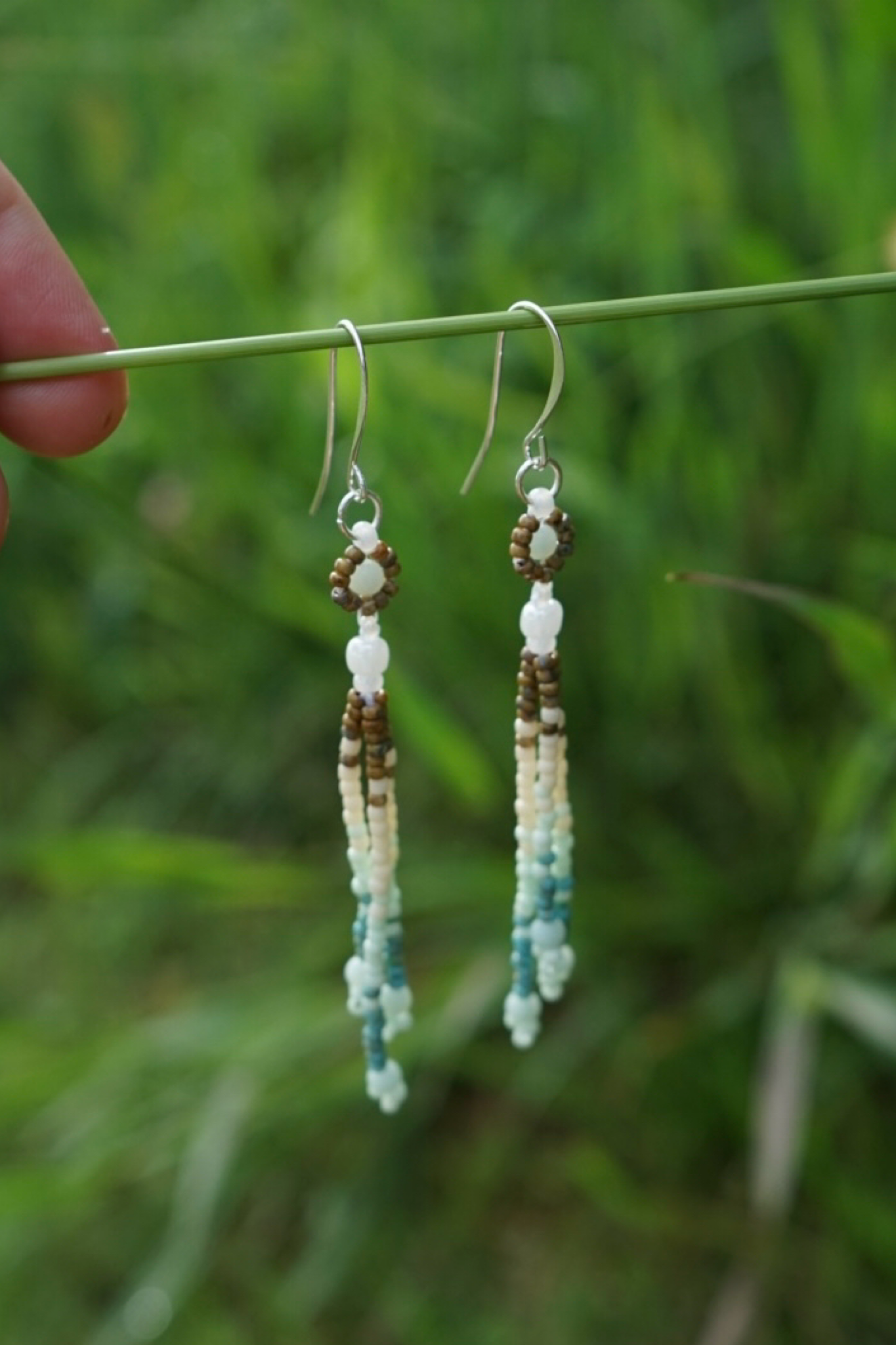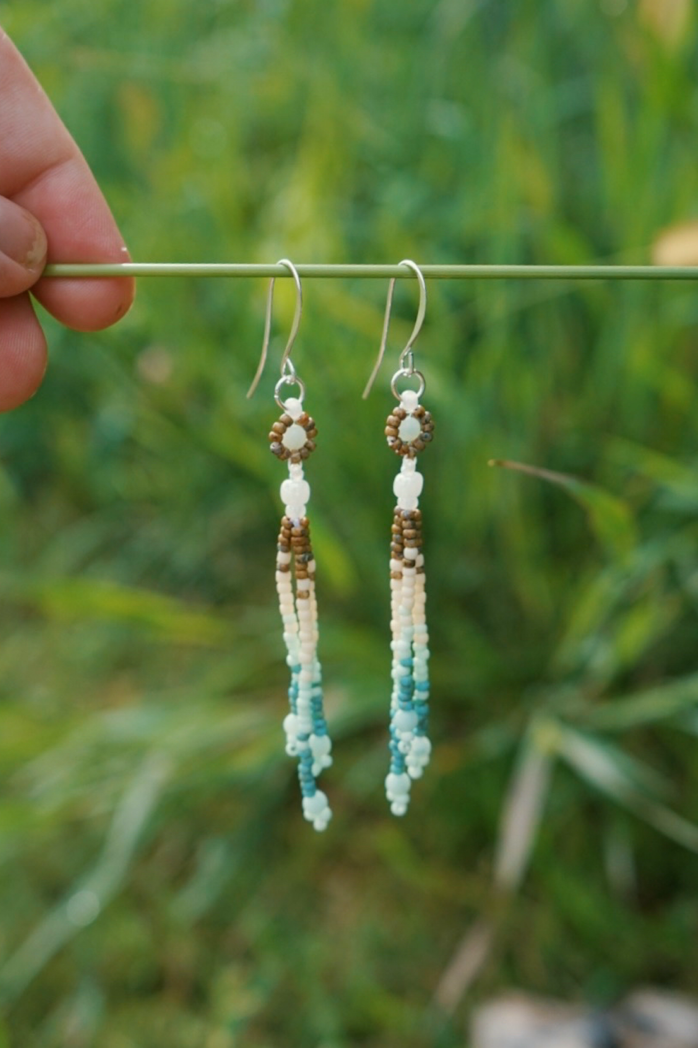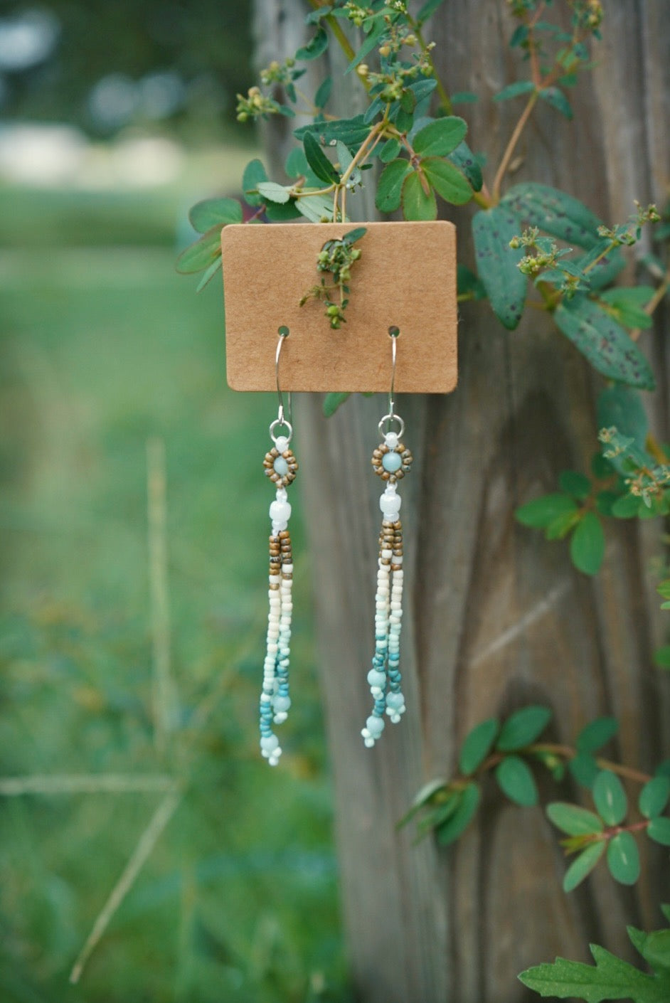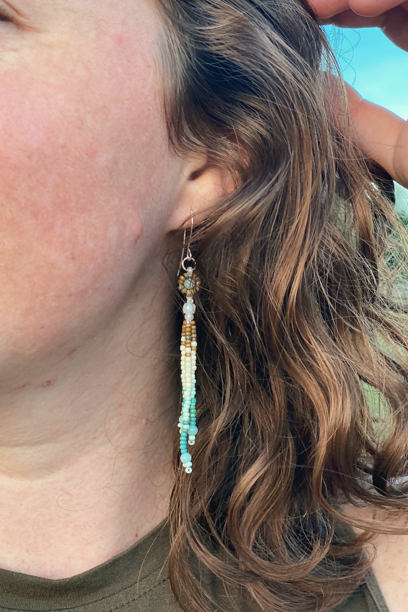 This pair of earrings is made with strands of brown, cream, and turquoise seed beads. The strands are connected at the top through a white pearl colored bead. There are round amazonite beads hanging from each strand, as well as at the center of a brown-petaled daisy at the top. This is one of my favorites of the daisy drops style - it features brown and turquoise "Picasso" seed beads, which have a marbleized finish with a beautiful array of colors when seen up close.