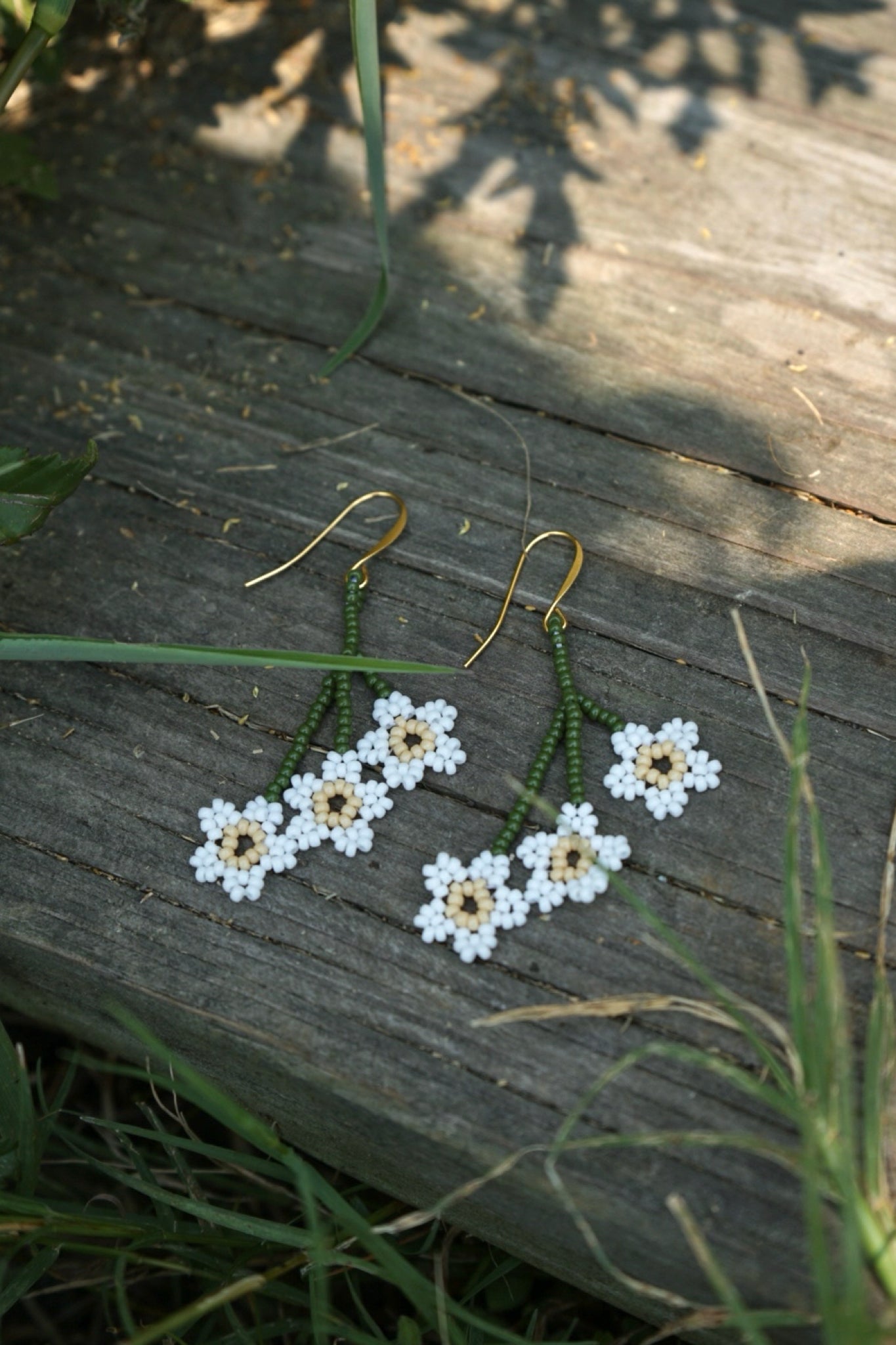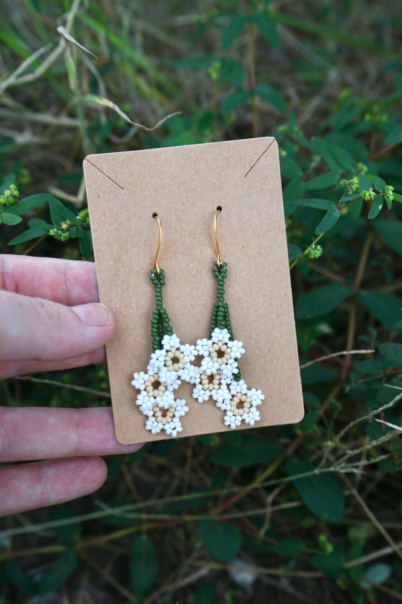 This dangly pair is made with white and butter yellow colored, cinque flowers, woven together with dark green beads and gold earring hooks. This color combination reminds me of honeysuckle blooms and these earrings are just as sweet!