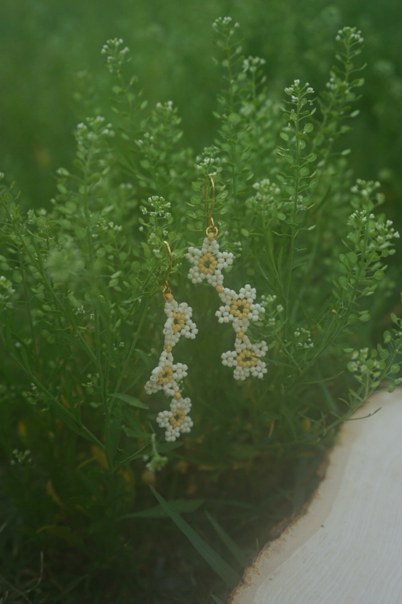 This dangly pair is made cream and butter yellow colored, cinque flowers with gold findings. This color combination reminds me of honeysuckle blooms and these earrings are just as sweet!