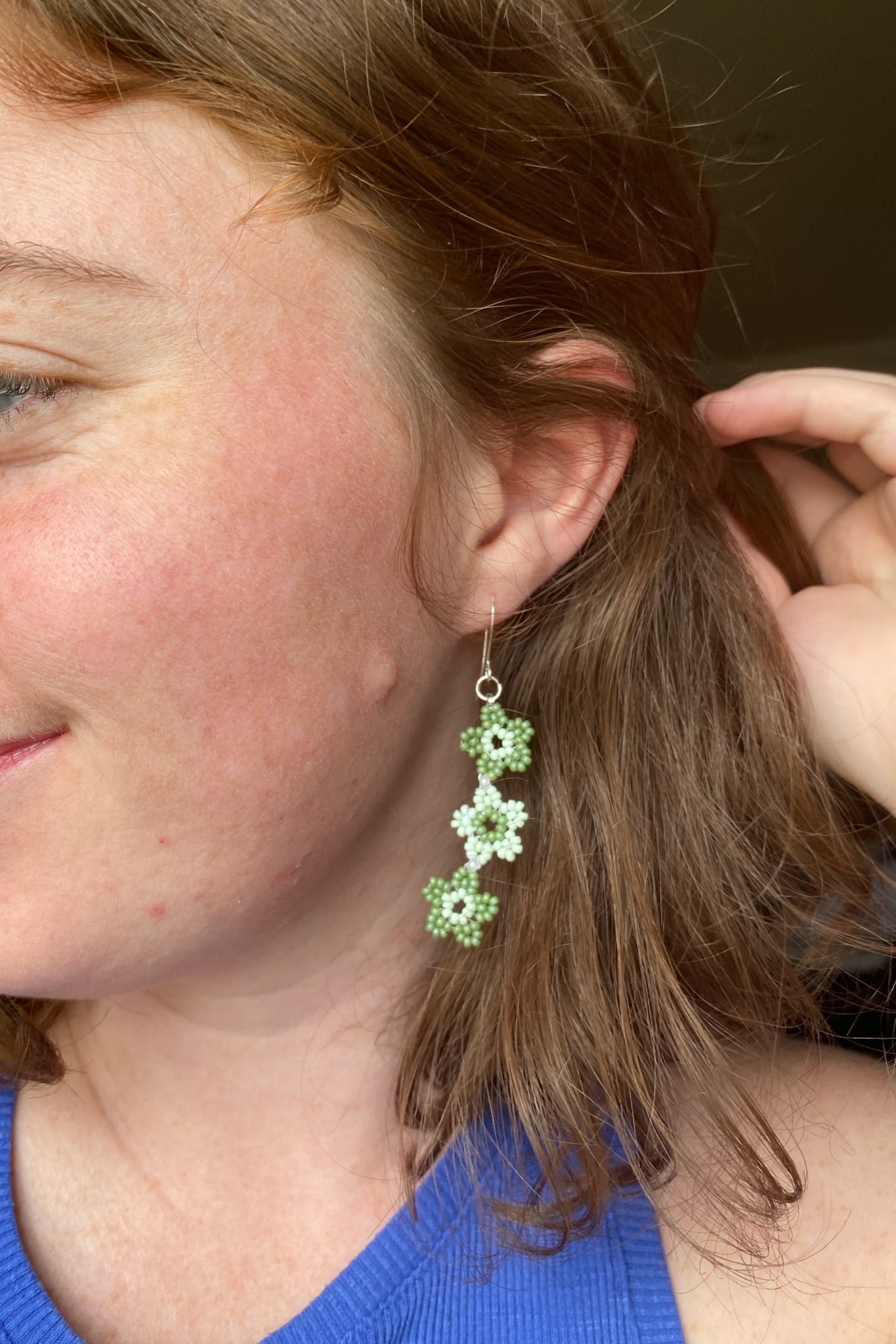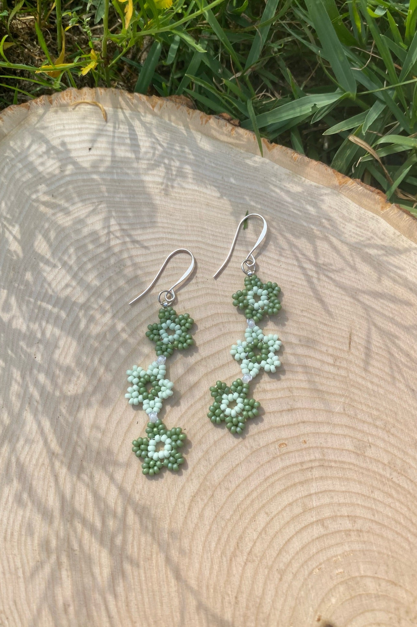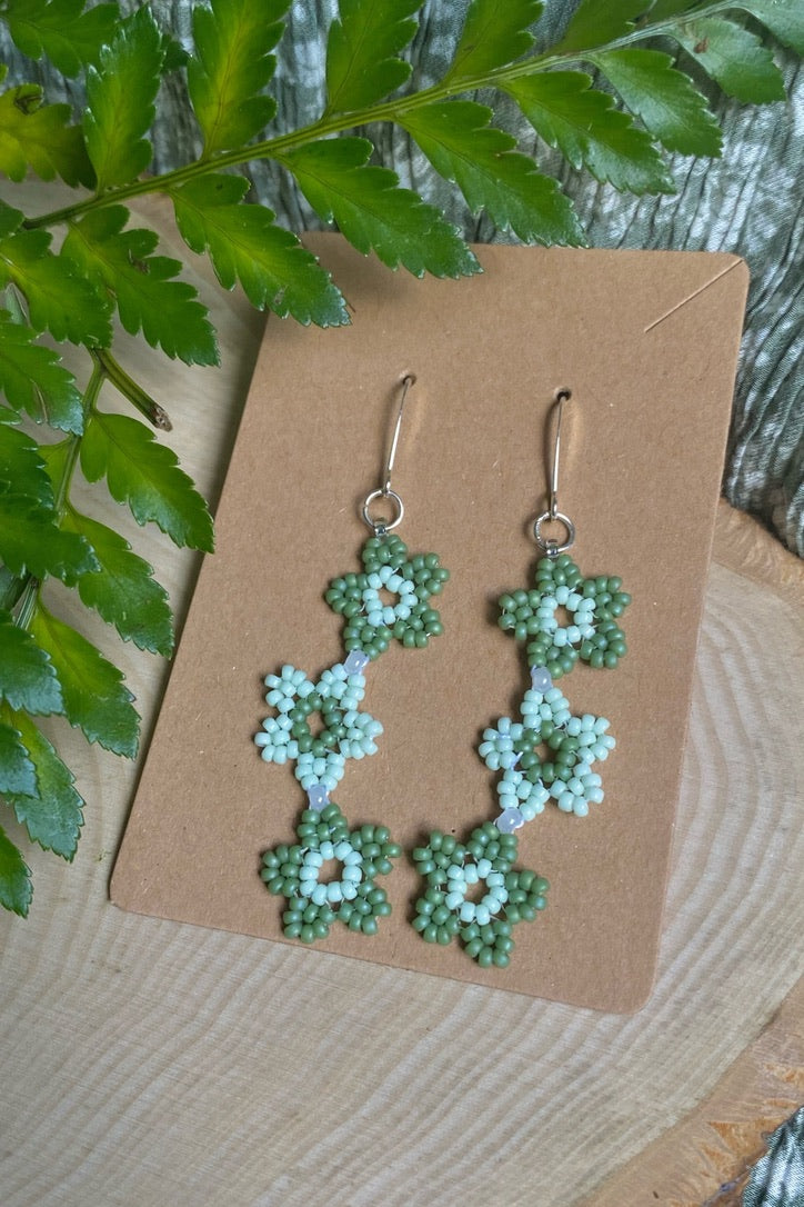 This dangly pair is made of juniper and mint green colored, cinque flowers with silver findings. A simple and sweet pair that can easily add interest or a bit of elegance to your look!