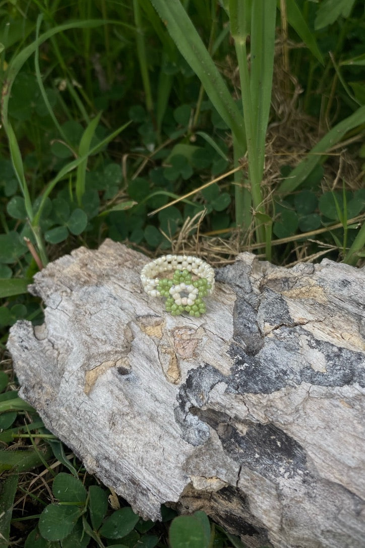 Made with size 11/0 seed beads. This ring features a flower with a cream center and sage green petals, and alternating cream + cream lined translucent beads for the band.