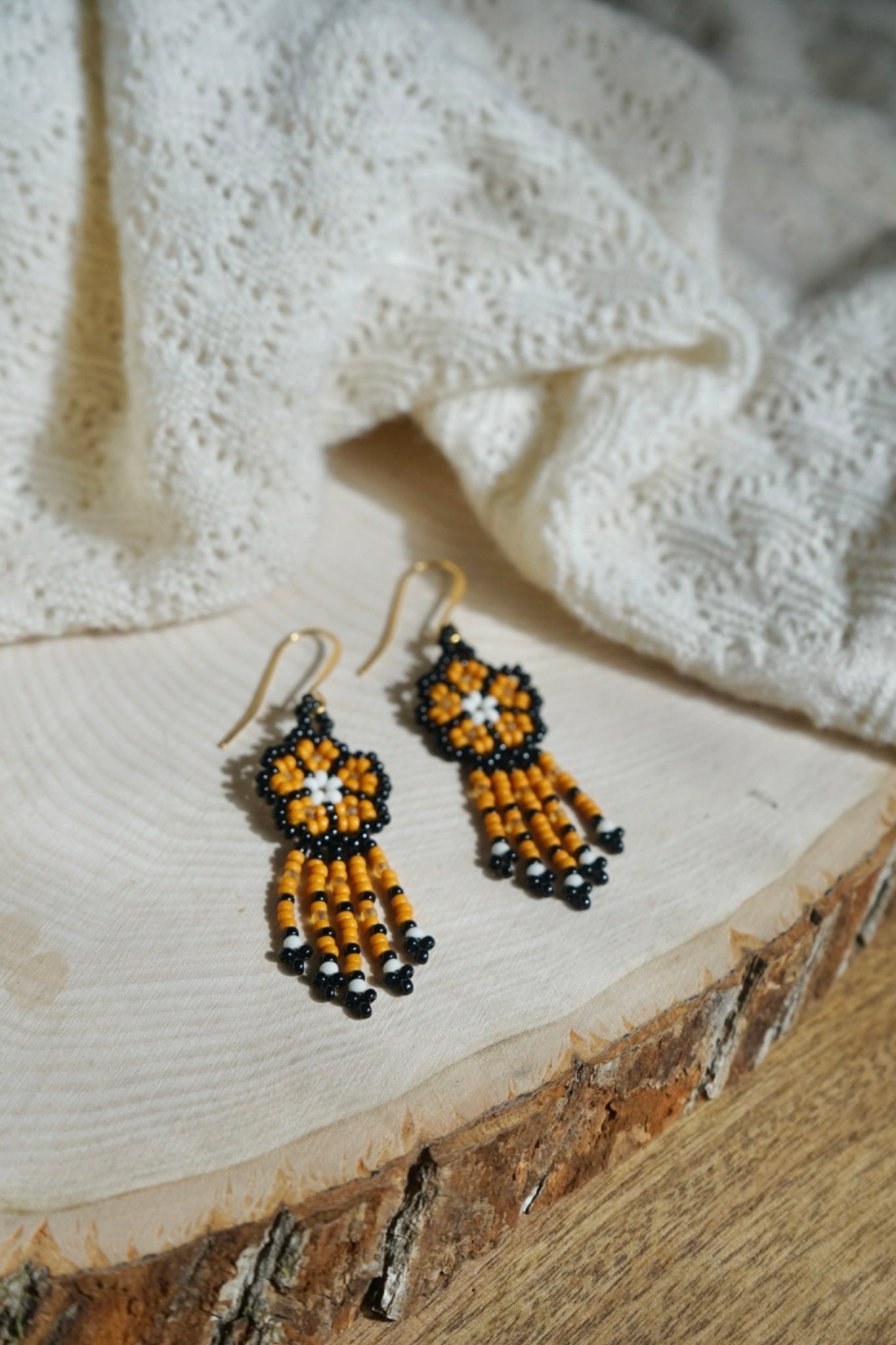 Inspired by the vibrant orange and black wings of a monarch butterfly - black beads surround orange petals, with a fringe of black, orange, and white beads hanging from the blooms.