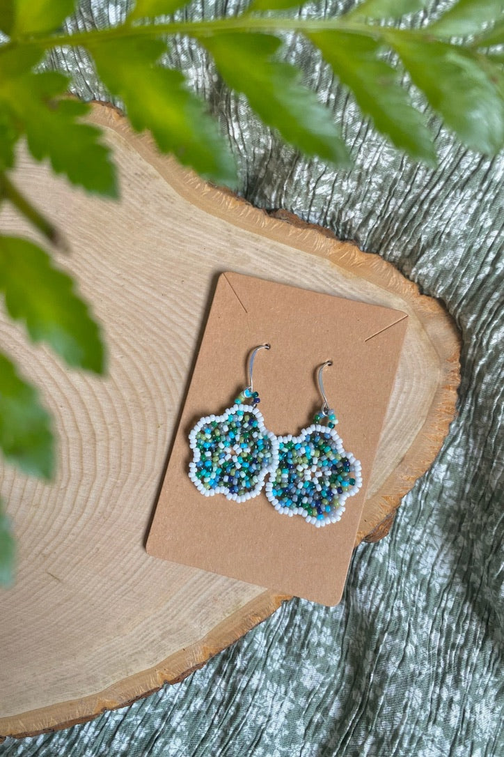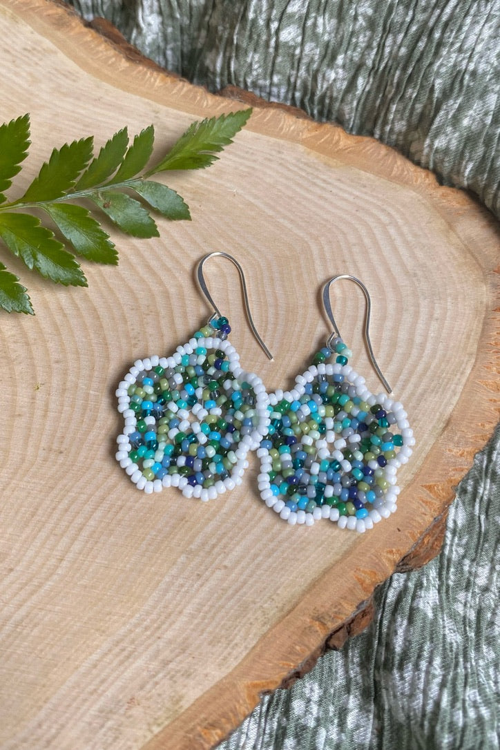This pair is made with a variety of blue, green, and gray beads, with a white outline. Reminiscent of a river full of smooth rocks.