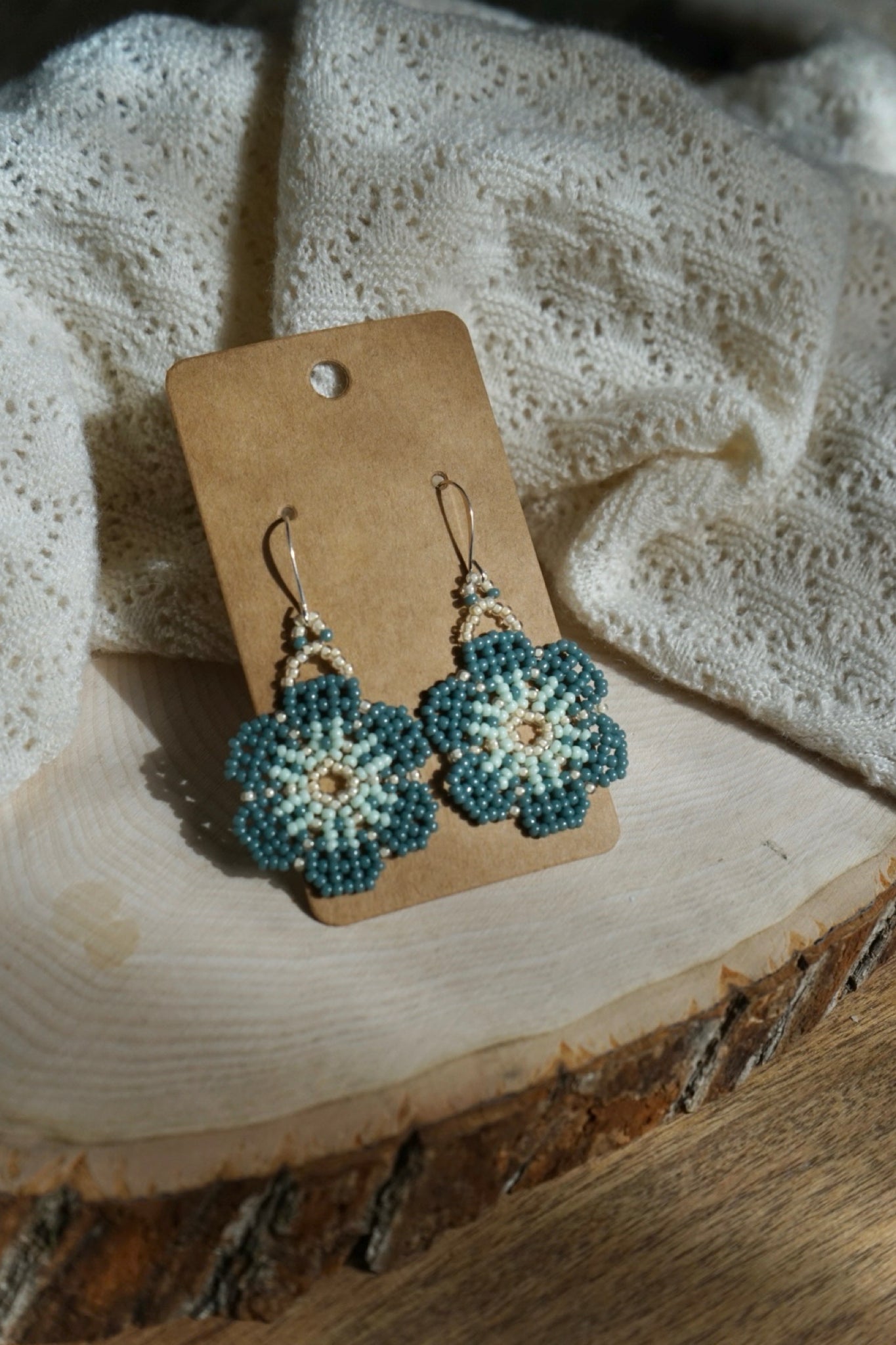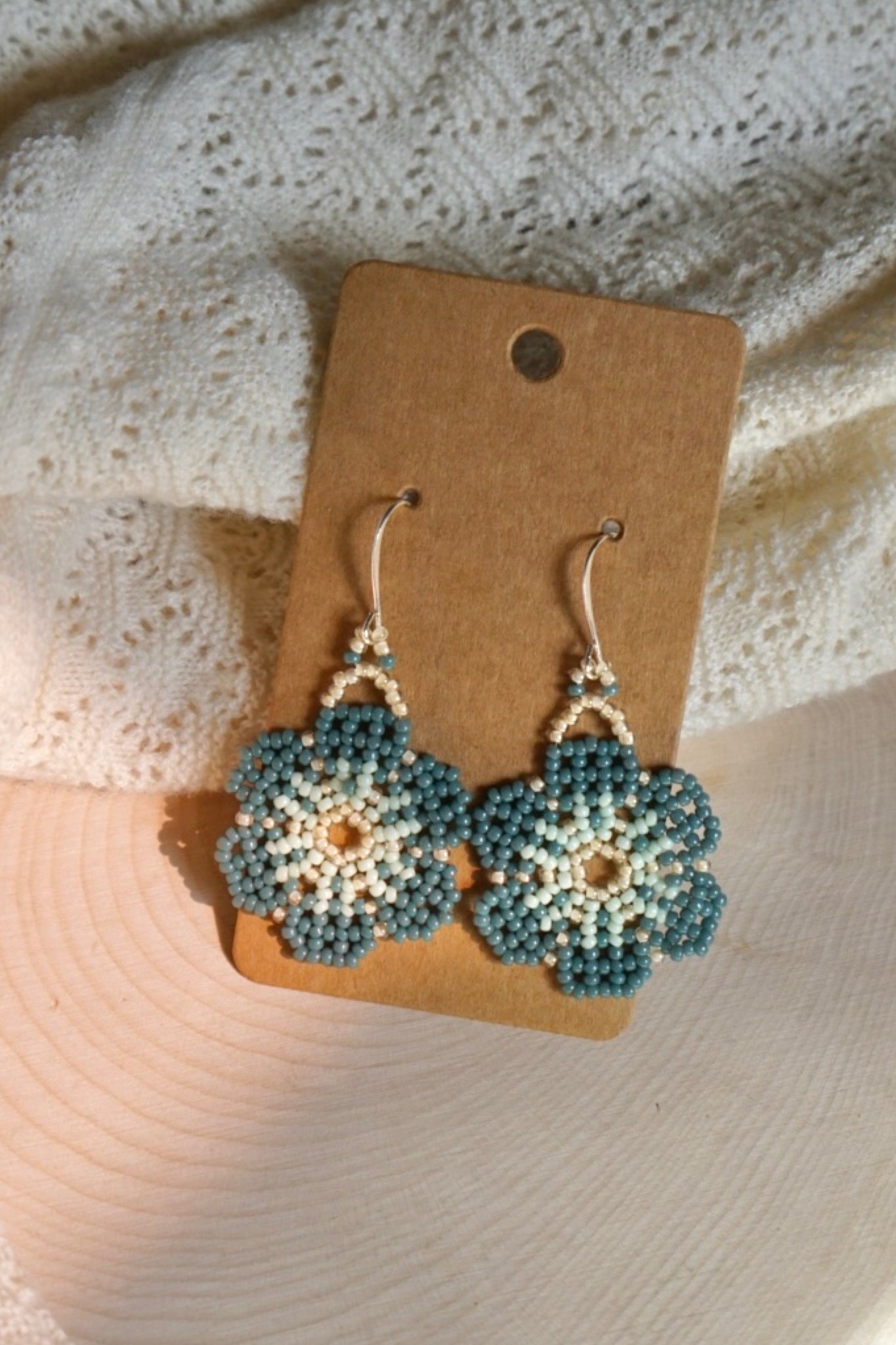 These earrings are made with size 11/0 seed beads and measure approximately 1.25" across. The earring hooks are silver-plated brass.