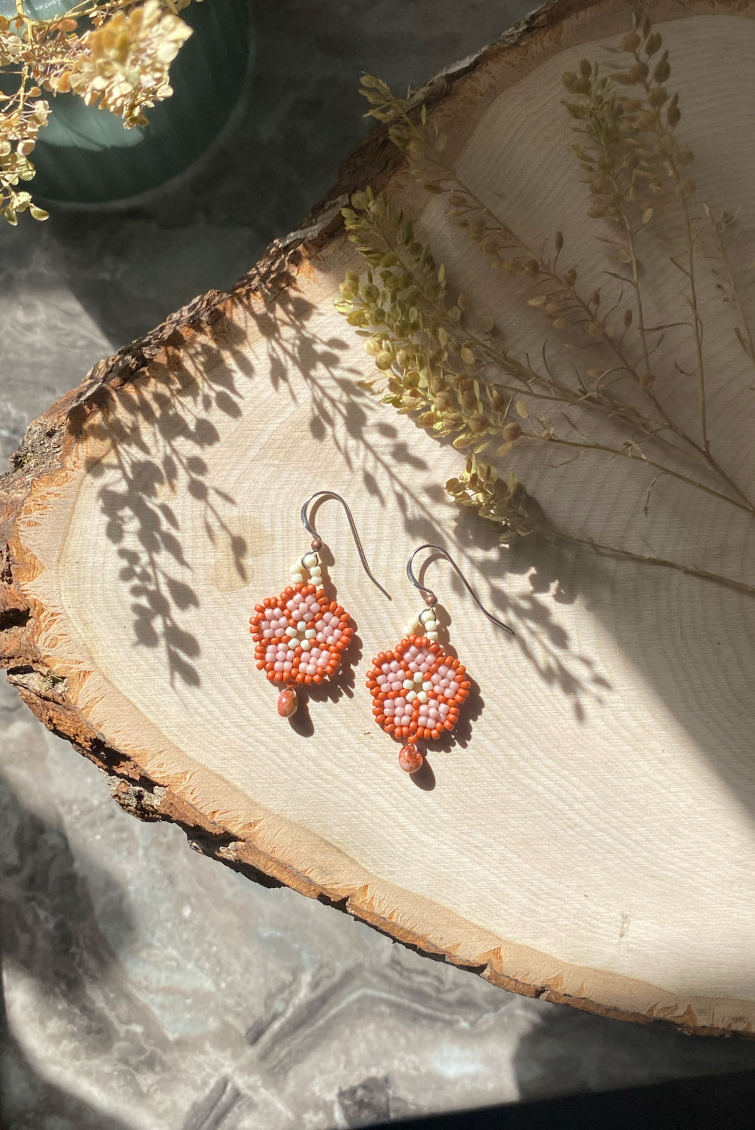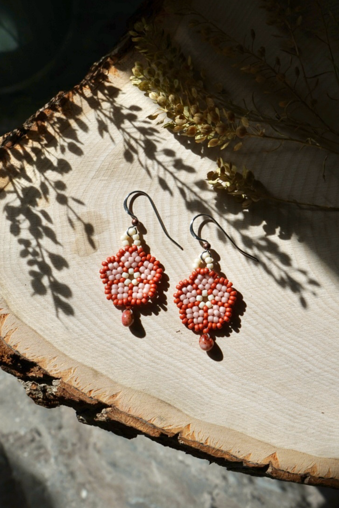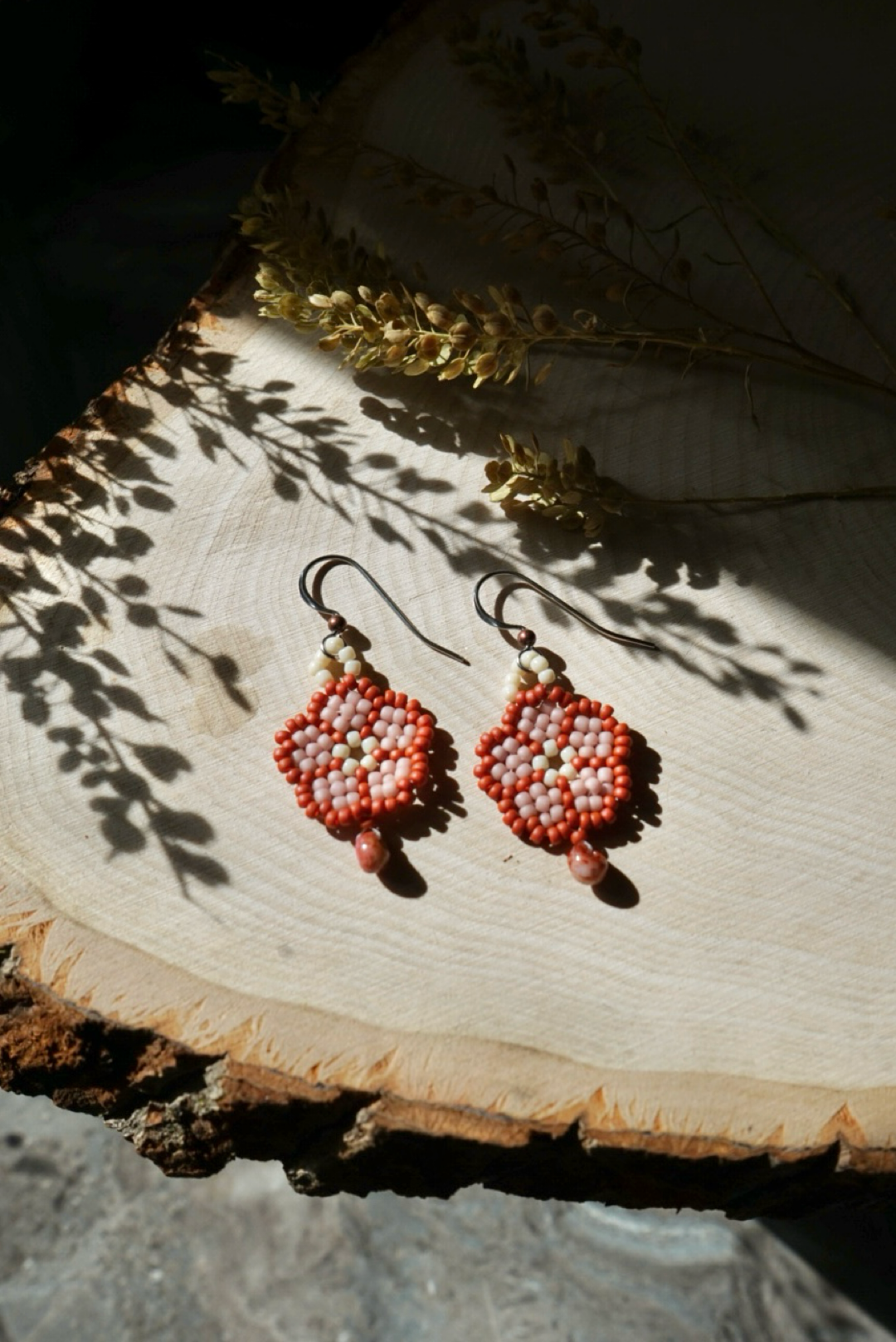 Dark sienna colored beads surround blush-colored petals, with a delicate pink teardrop-shaped bead hanging from the petals. This pair is pink, but not too pink, like an earthy desert valentine.