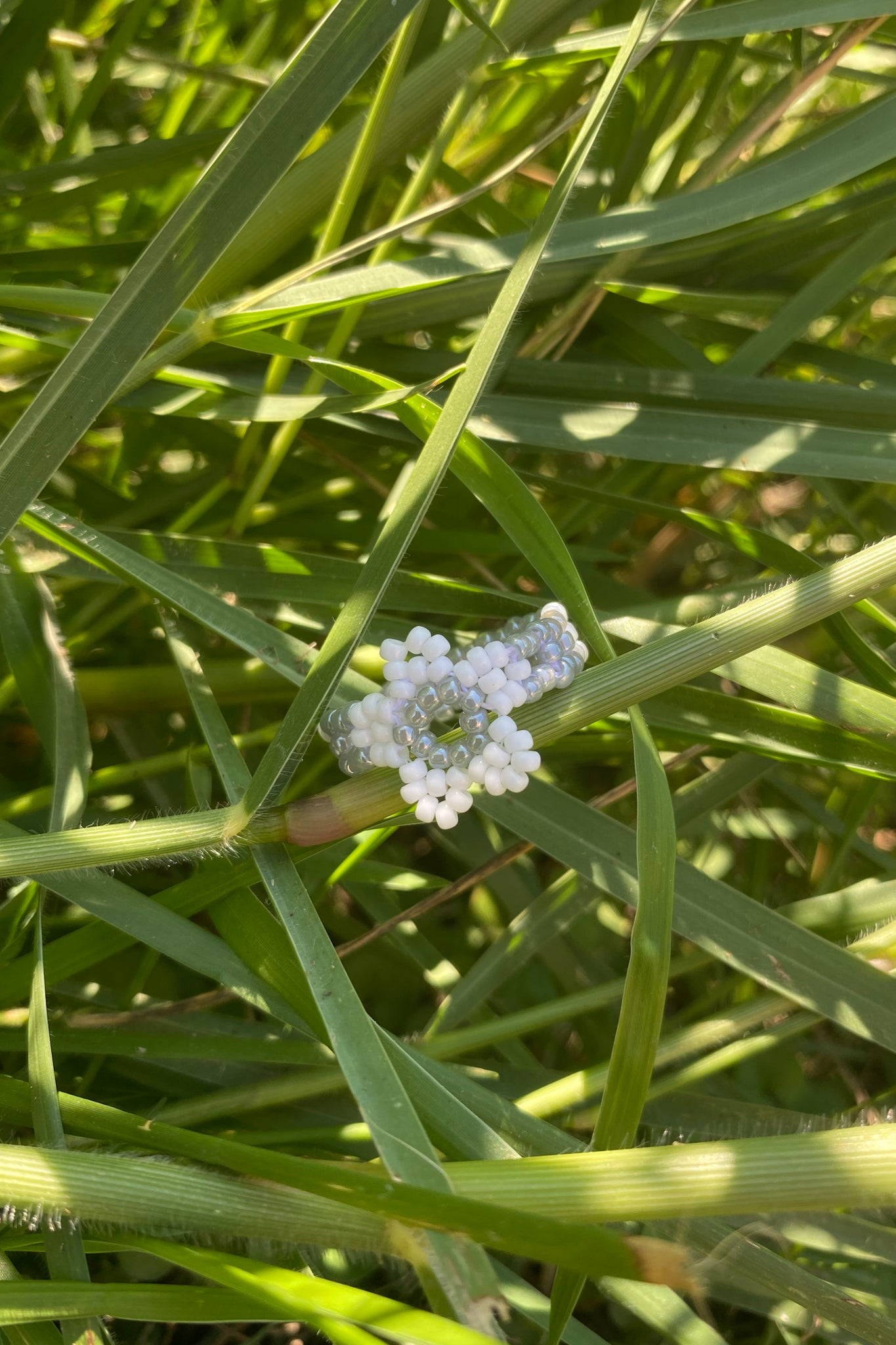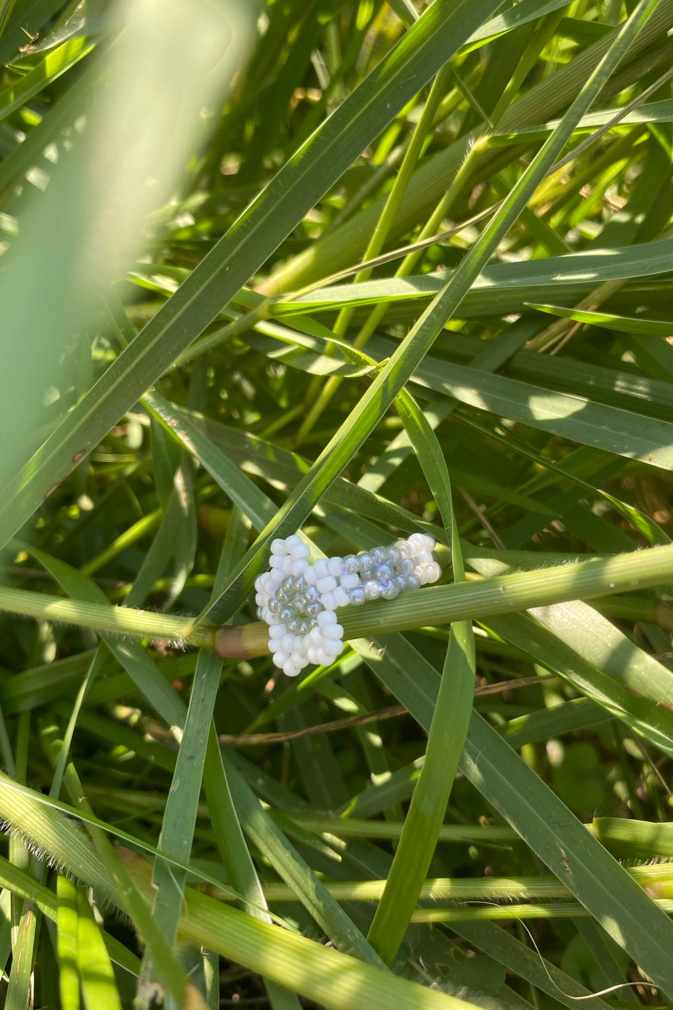 This ring is made with size 11/0 seed beads - and features a white-petaled bloom and pearlescent gray bands.