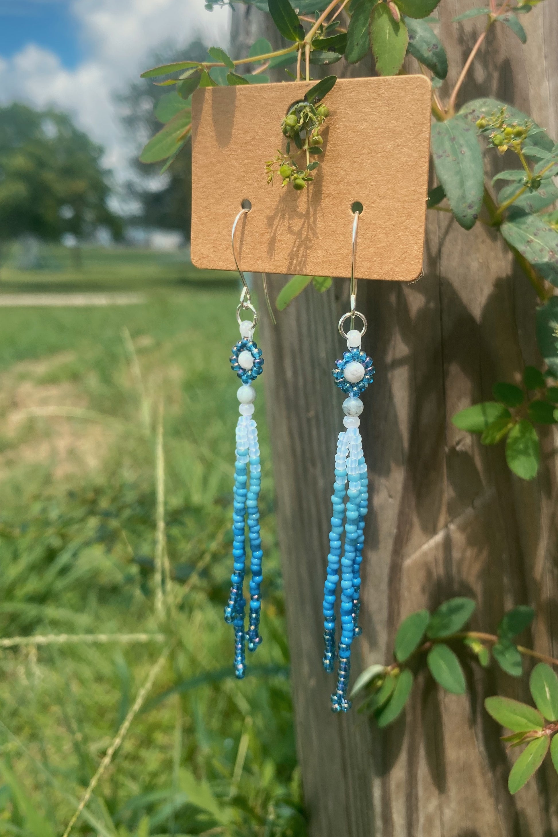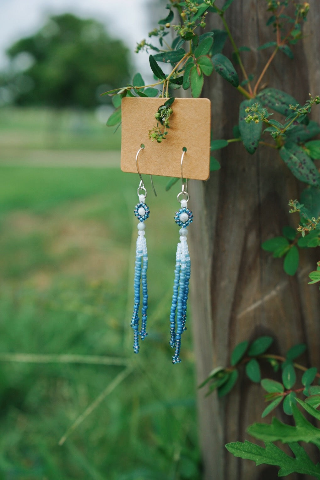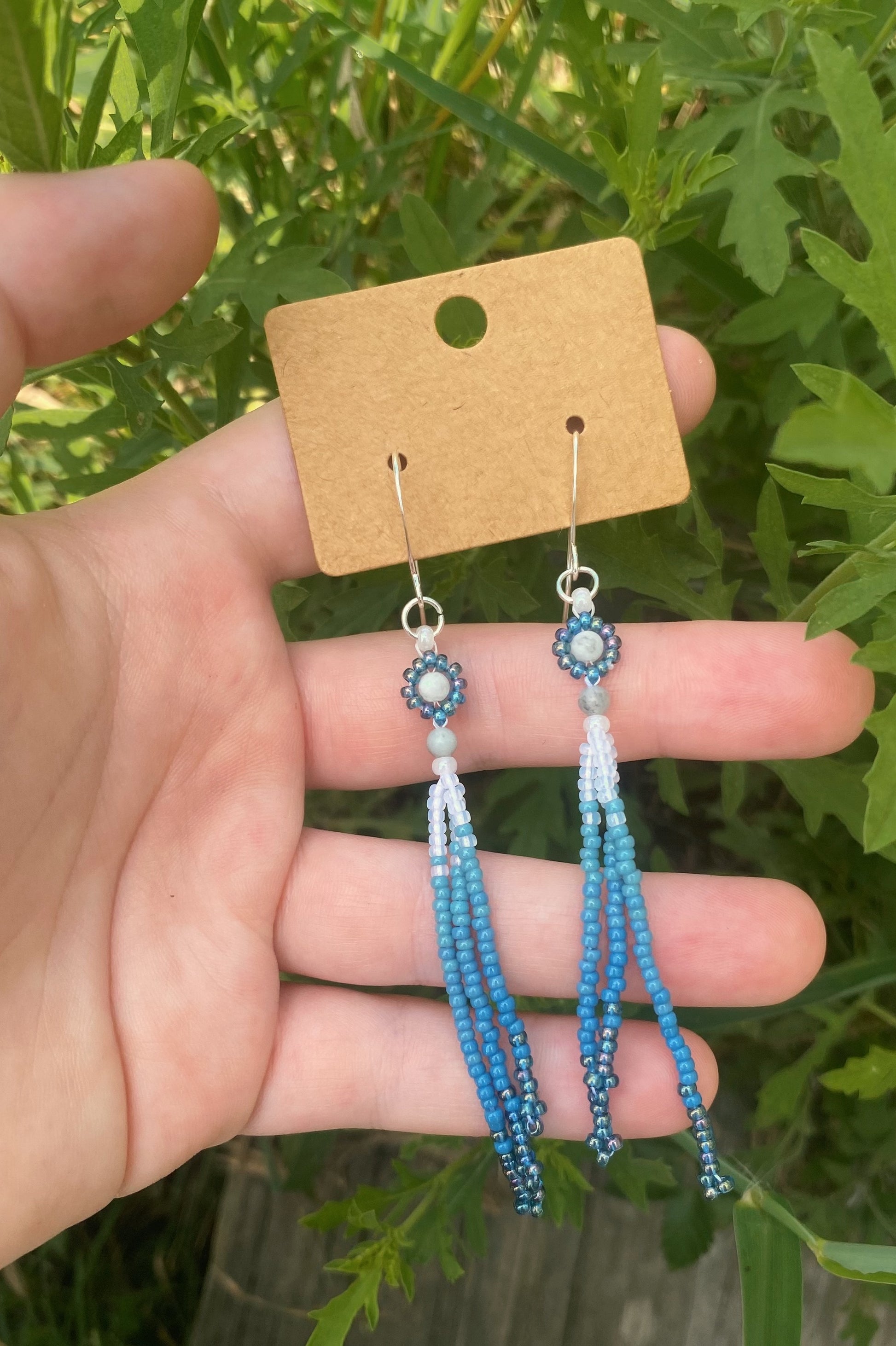 These earrings are made with a a gradient of deep blue seed beads. Round amazonite beads join the strands together and form the center of a beaded daisy at the top of each earring.
