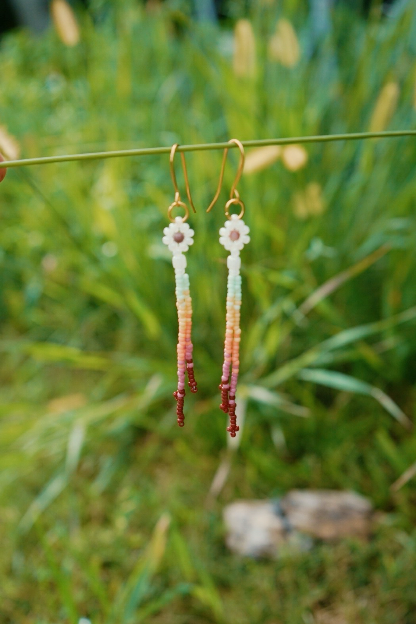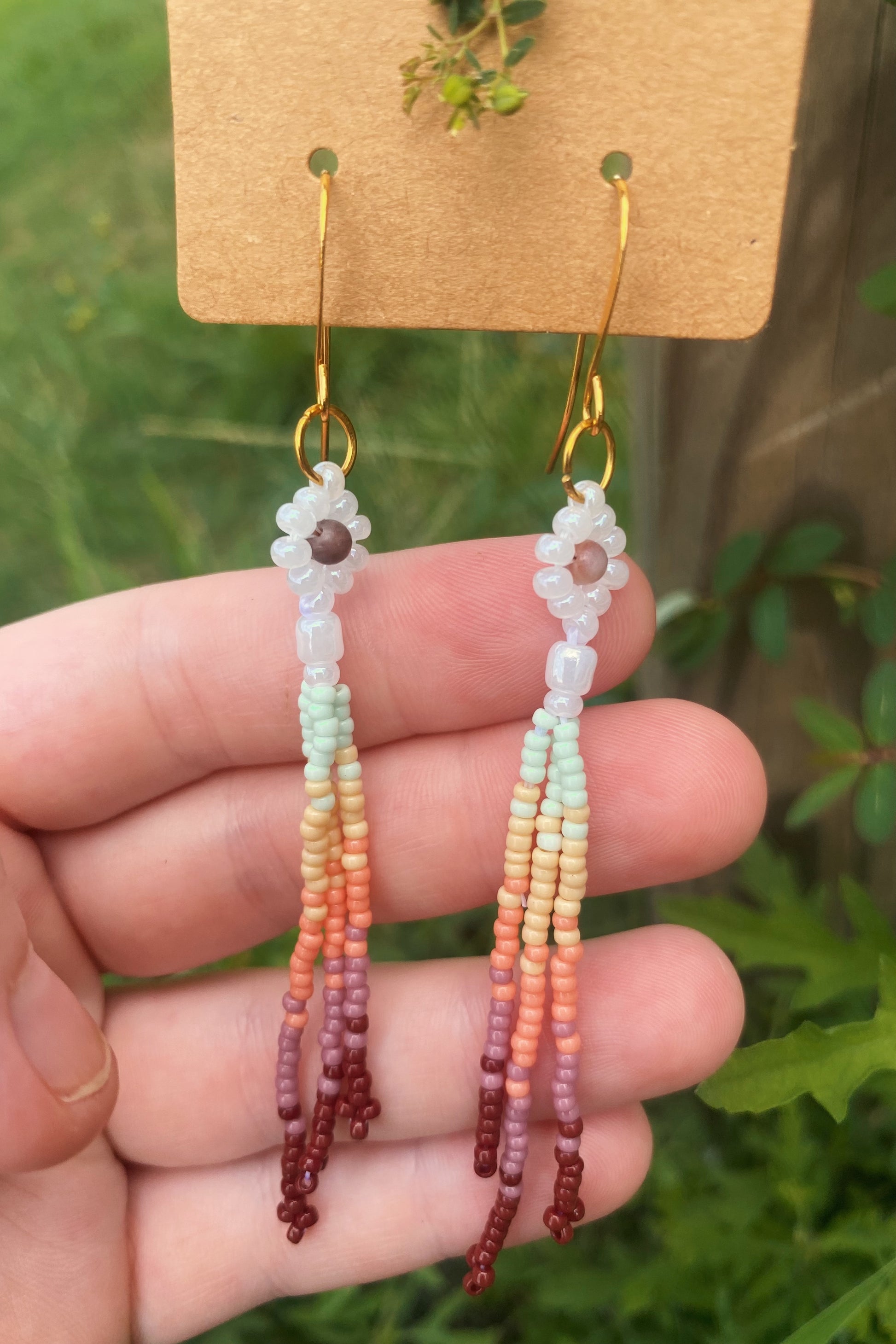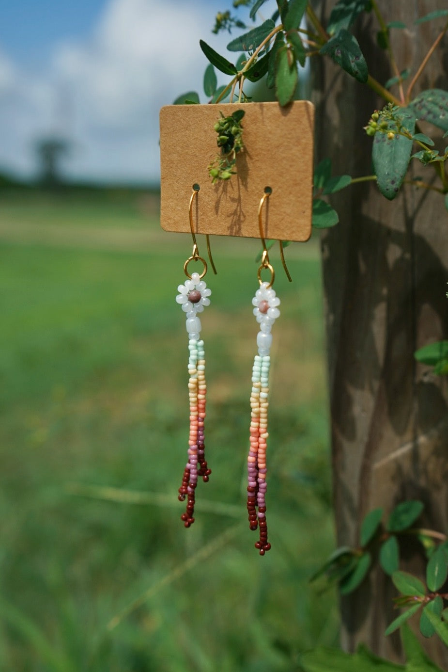 With strands of mint green, pale yellow, peachy pink, and maroon colored seed beads, this is a colorful pair to brighten any day. At the top of each earring is a beaded daisy, with white, pearl colored petals around a maroon colored Amazonite bead.