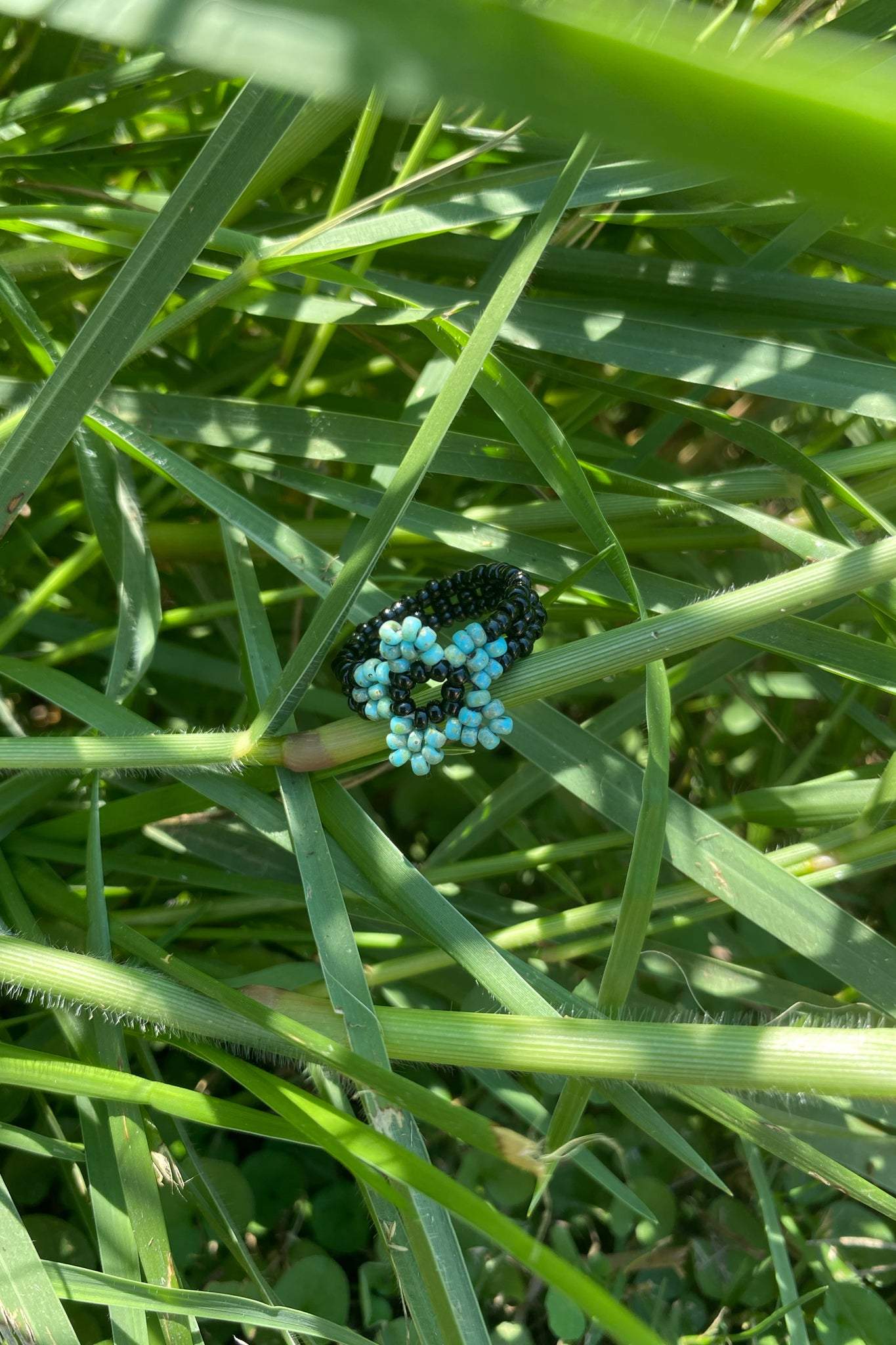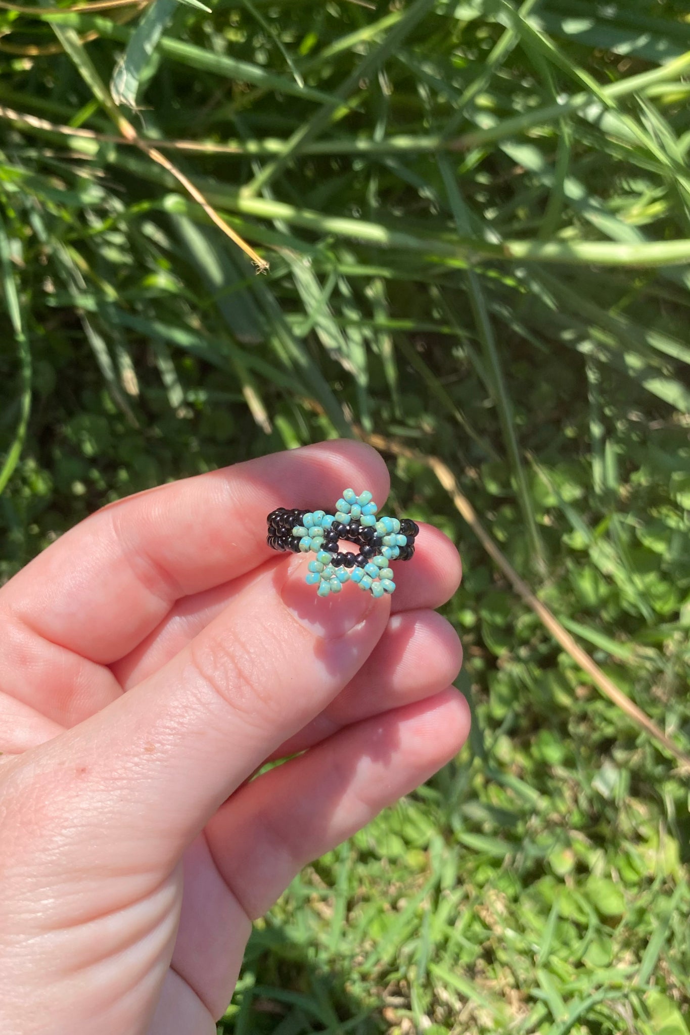 This ring is made with size 11/0 seed beads - and features a turquoise colored bloom and a black-colored band.