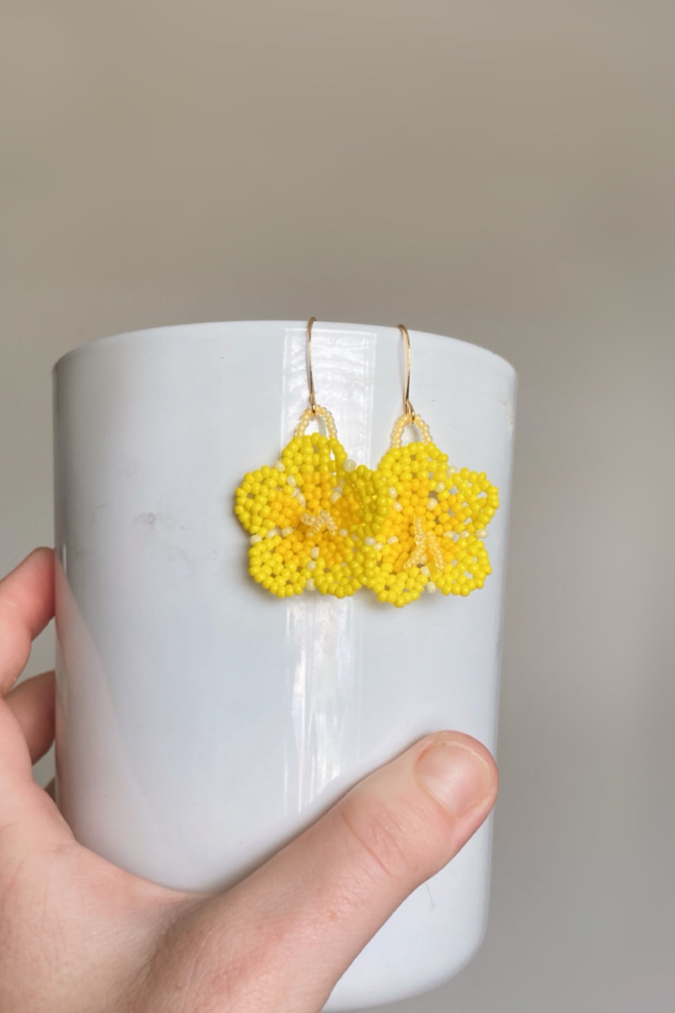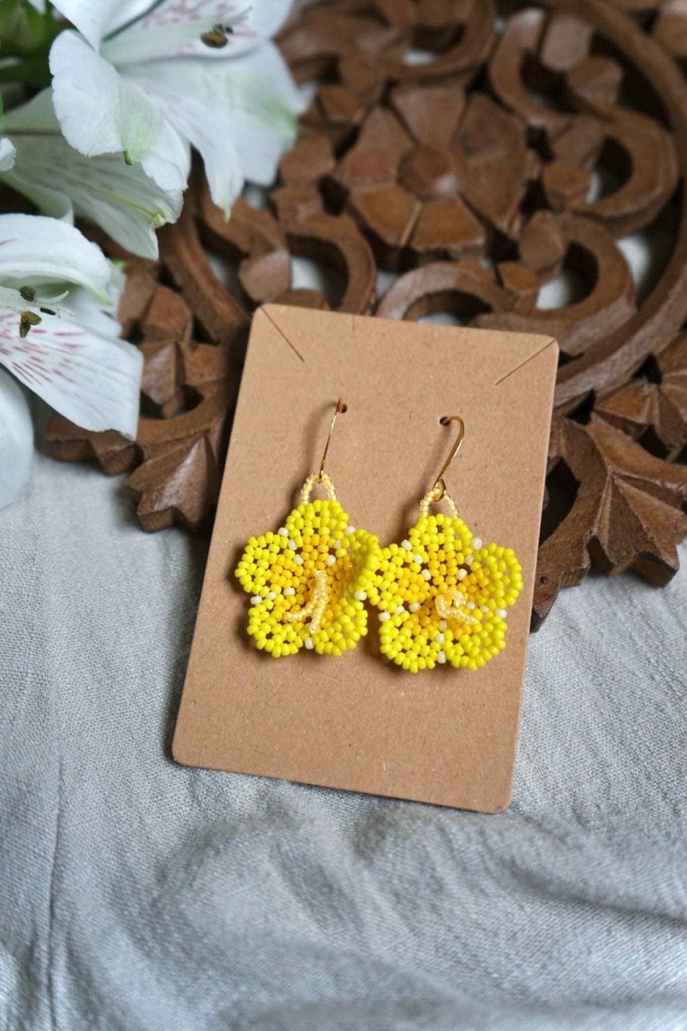 These earrings measure approximately 1.25" across and are made with size 11/0 seed beads as well as size 13/0 seed beads for a 3D pop with the center stamens.